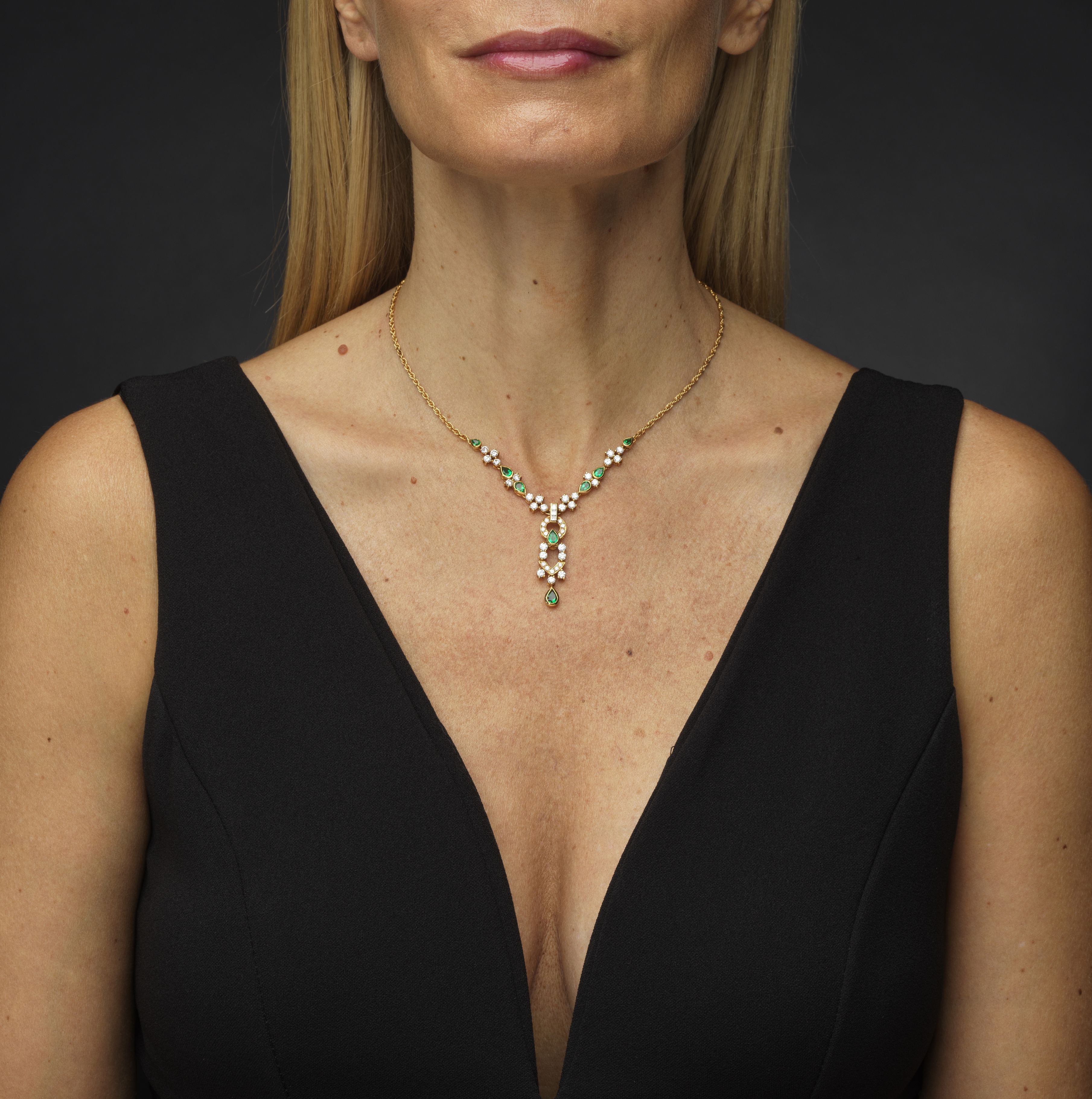 4595. Collier à maille torsadée centré d'un motif serti d'émeraudes taille poire et de diamants