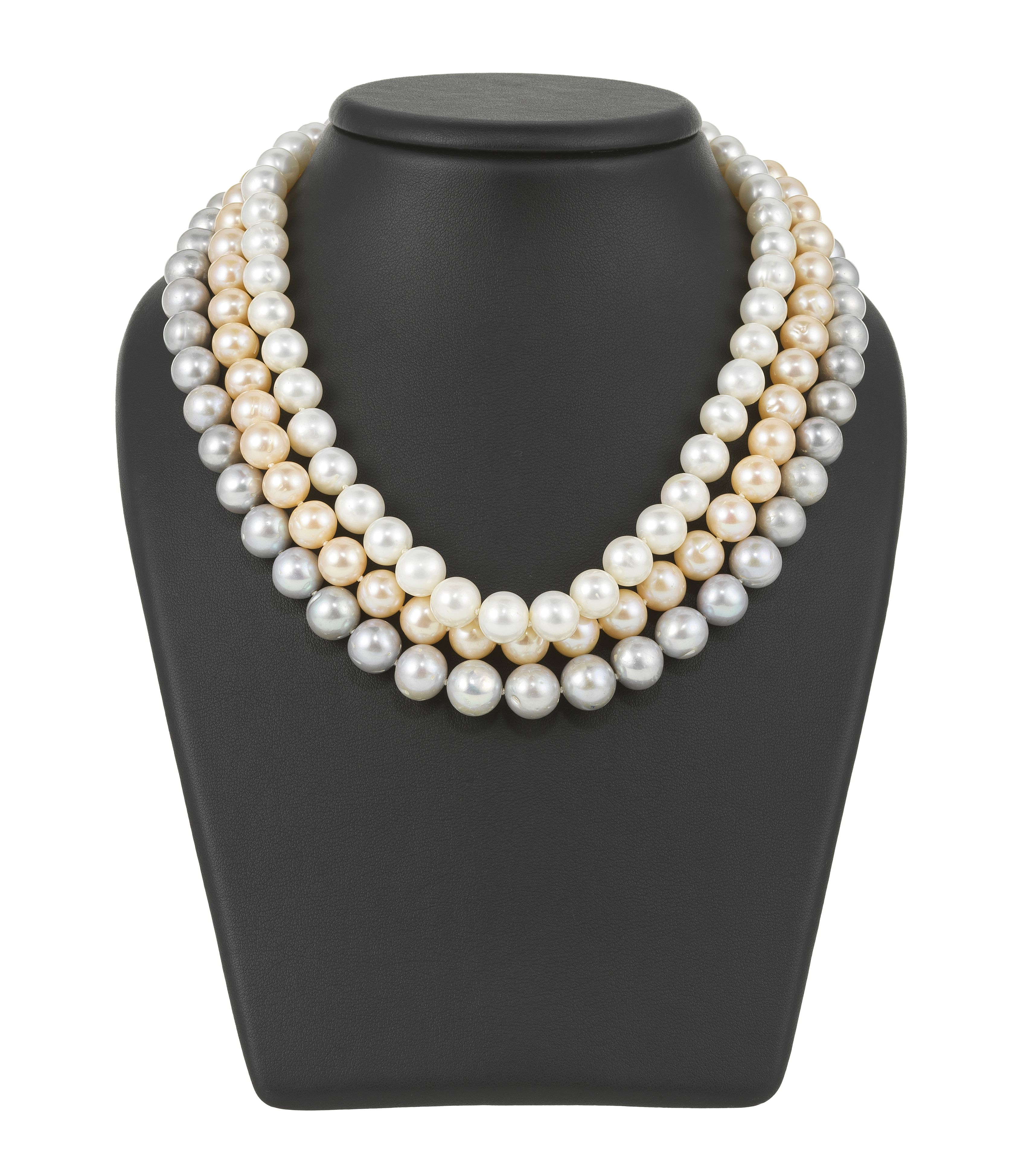 4030. *Collier composé de trois rangs de perles blanches, rosées et gr...
