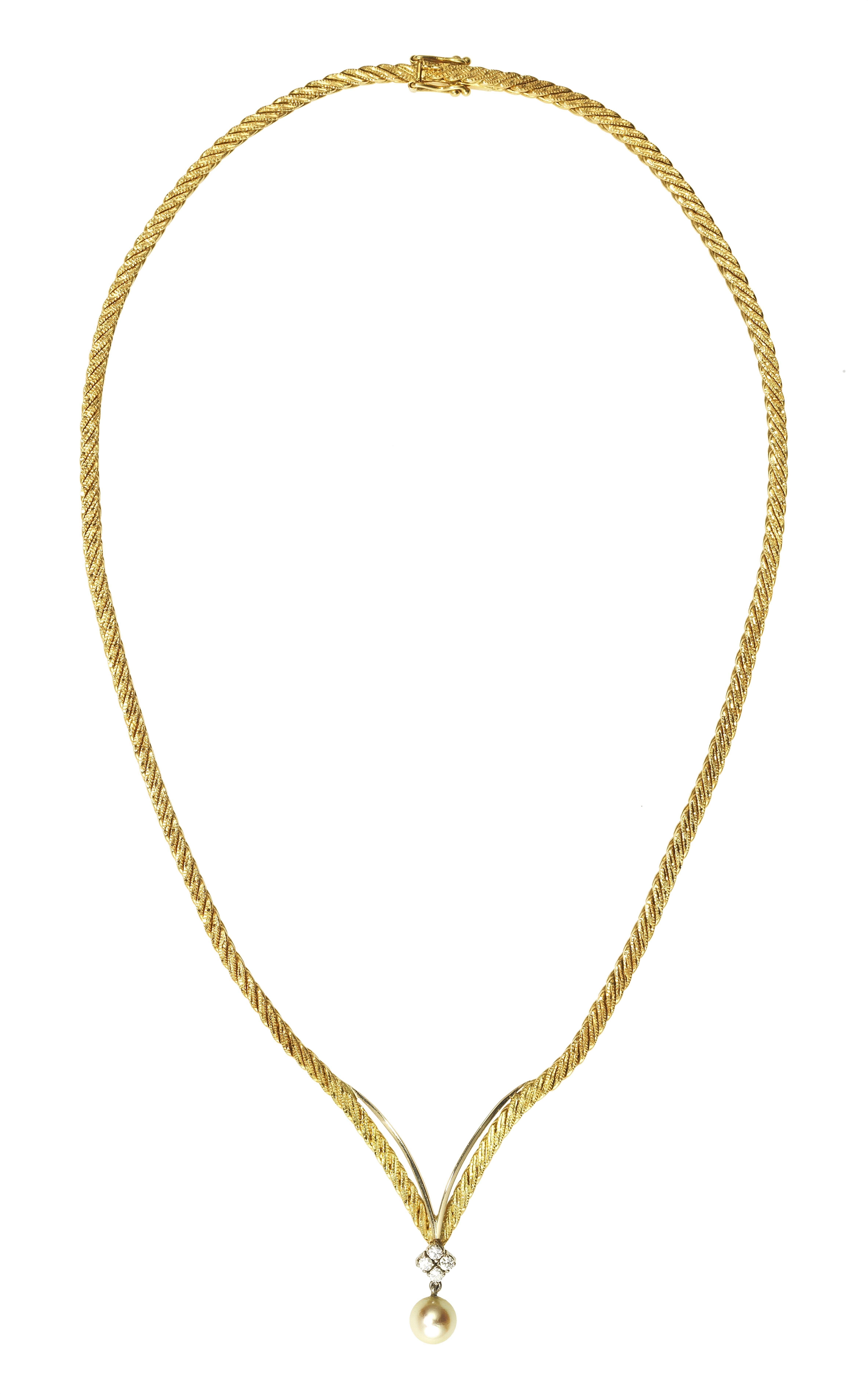 Retenant une perle (D env. 7 mm) rehaussée de quatre petits diamants, or et or gris 750, L 44 cm, 37 g