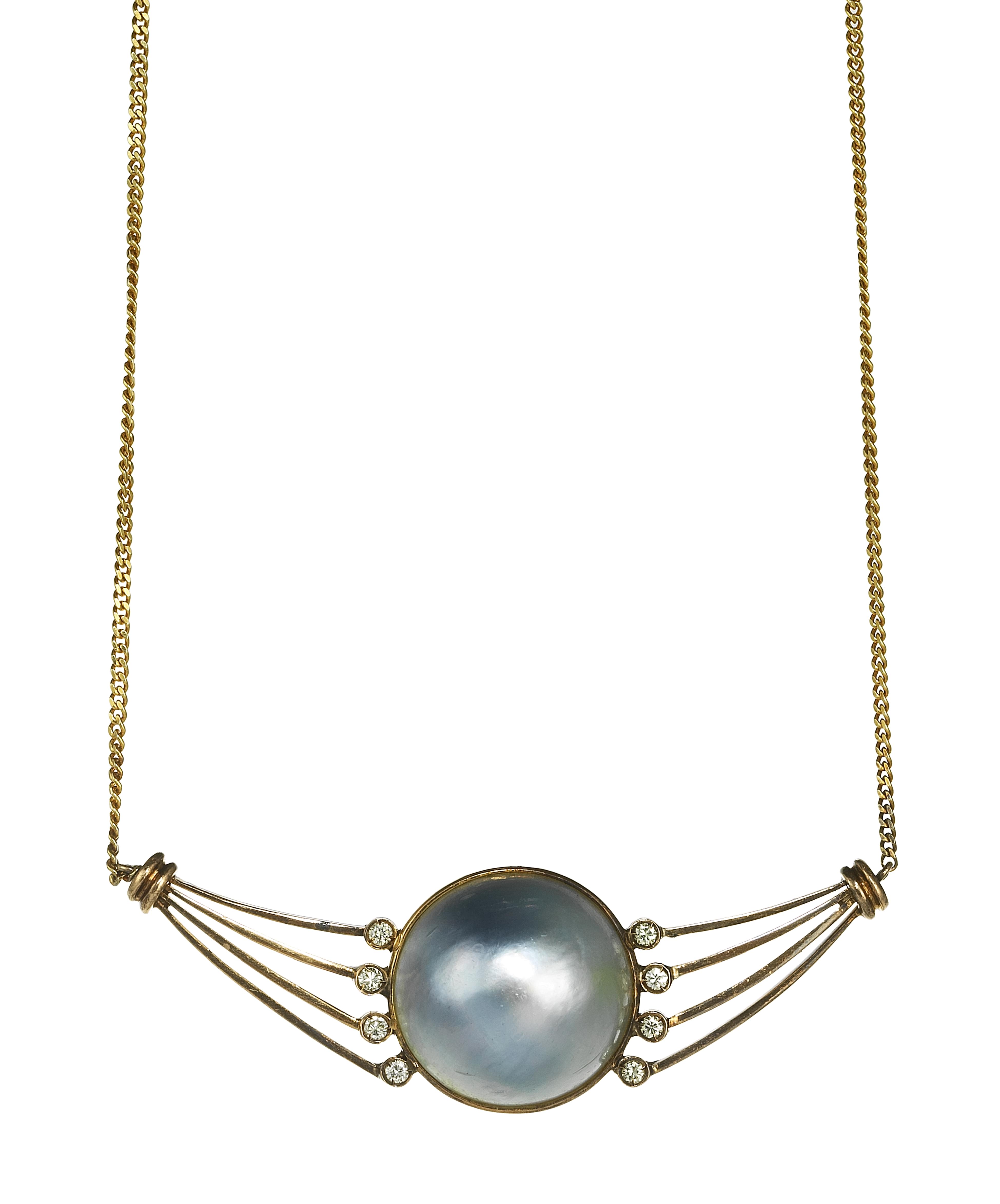 3124. Collier tour de cou centré d'un motif ajouré serti d'une demi-perle grise épaulée de huit diamants