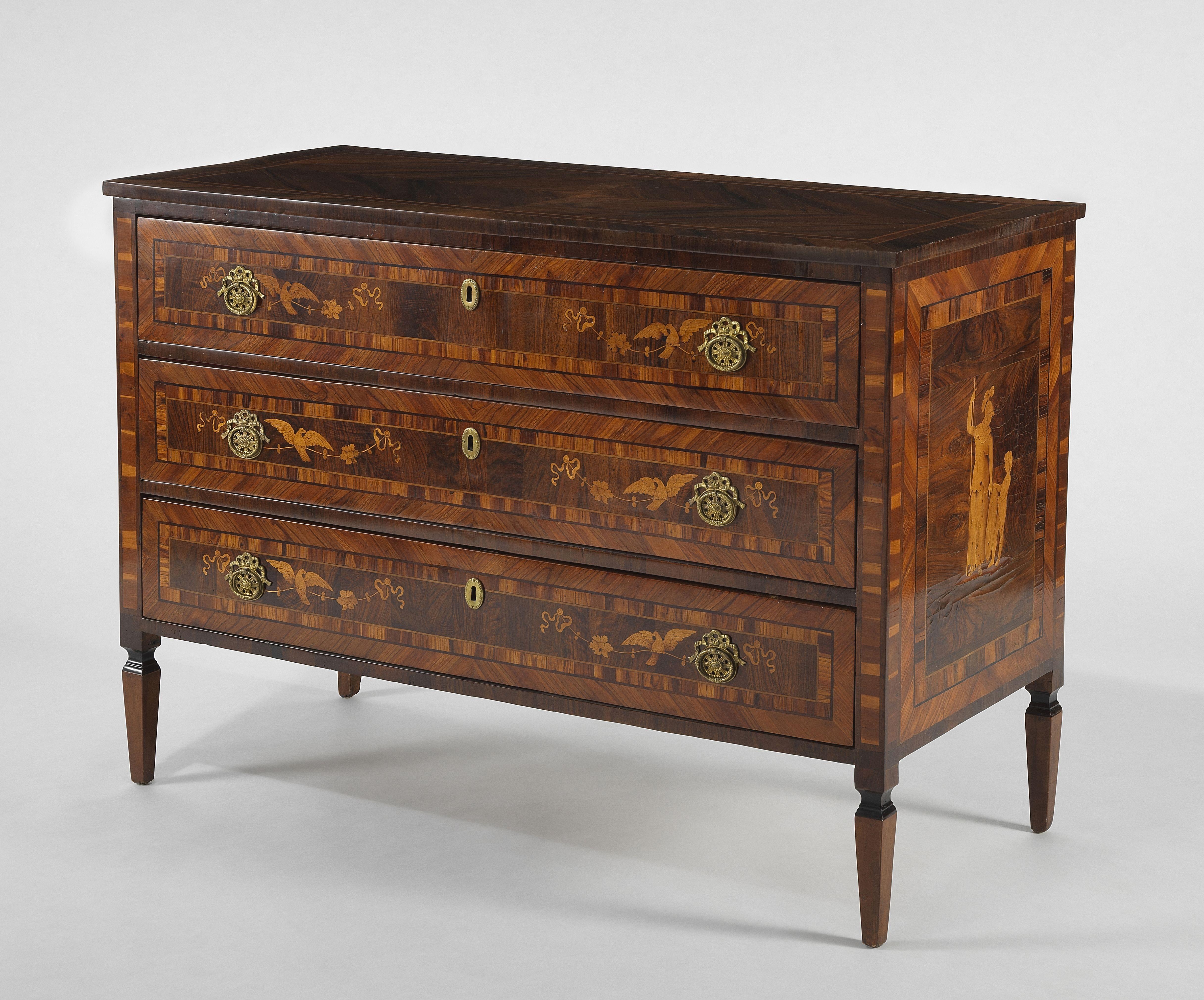 Trois tiroirs, bois fruitier à décor marqueté de colombes et guirlandes de fleurs, 86x123x55 cm