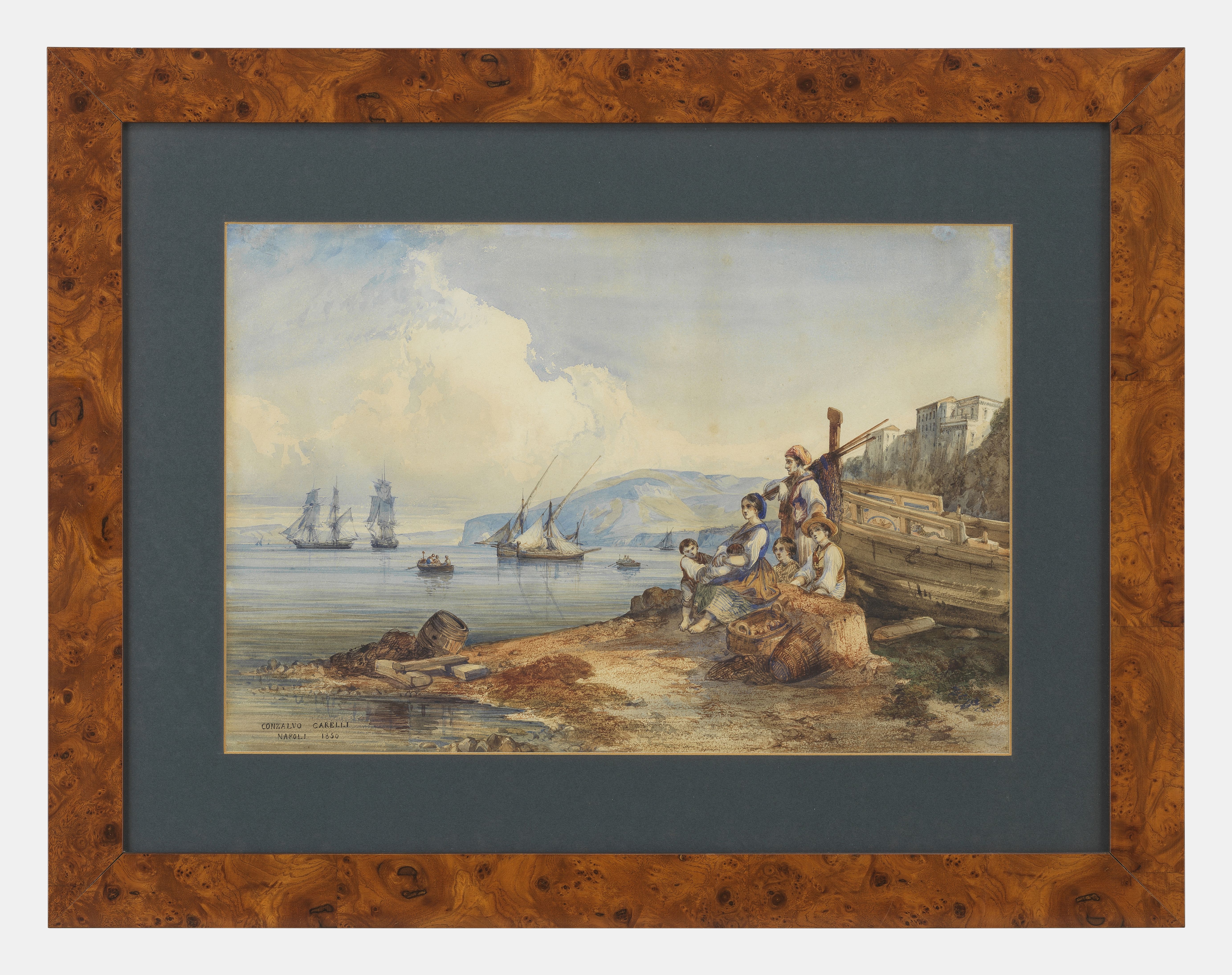 Famille de pêcheur au bord de la mer, gouache sur papier, signée et datée 1850, 30x44 cm