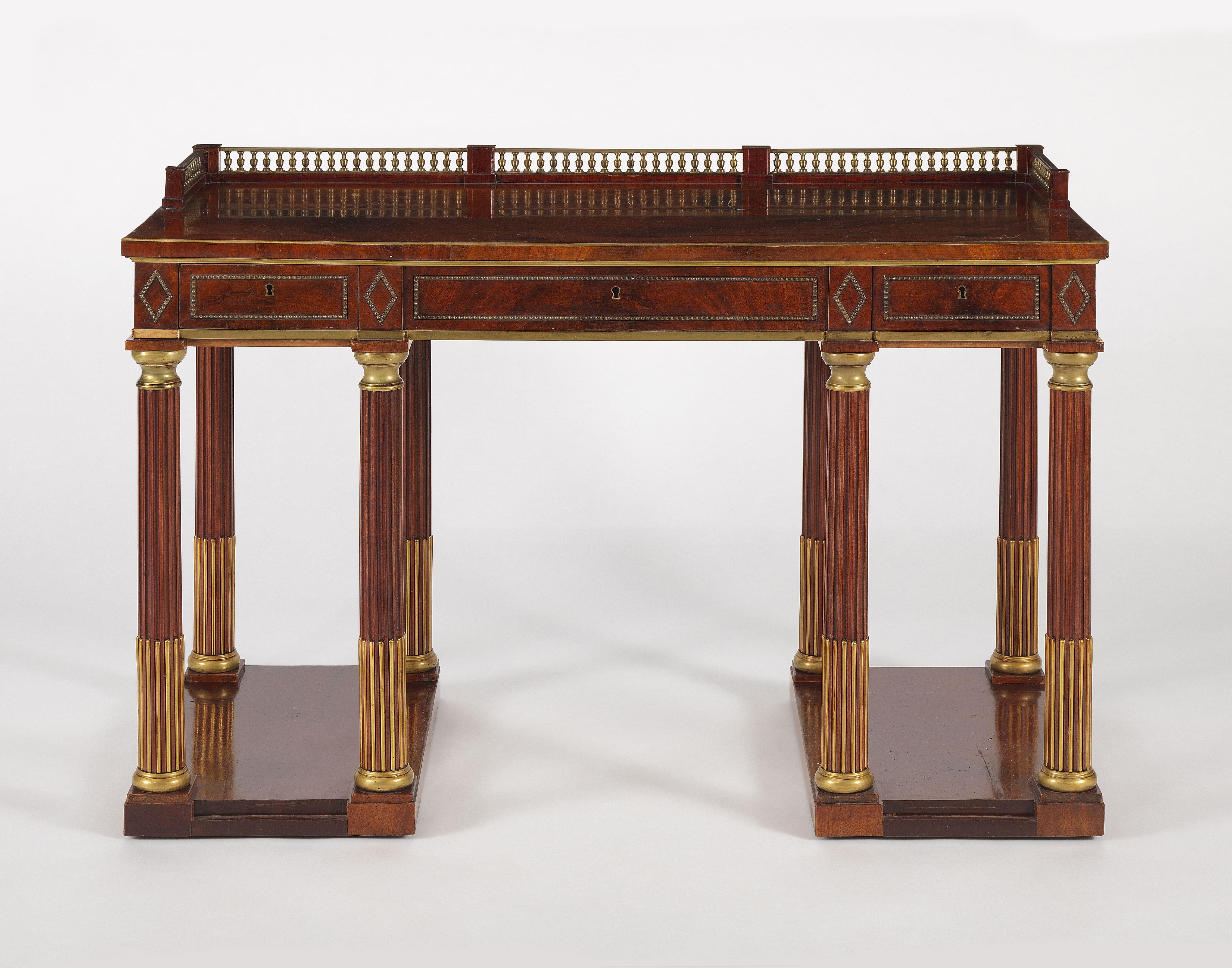 Montants en colonnes cannelées baguées de laiton, plateau à galerie, 88x125x59 cm