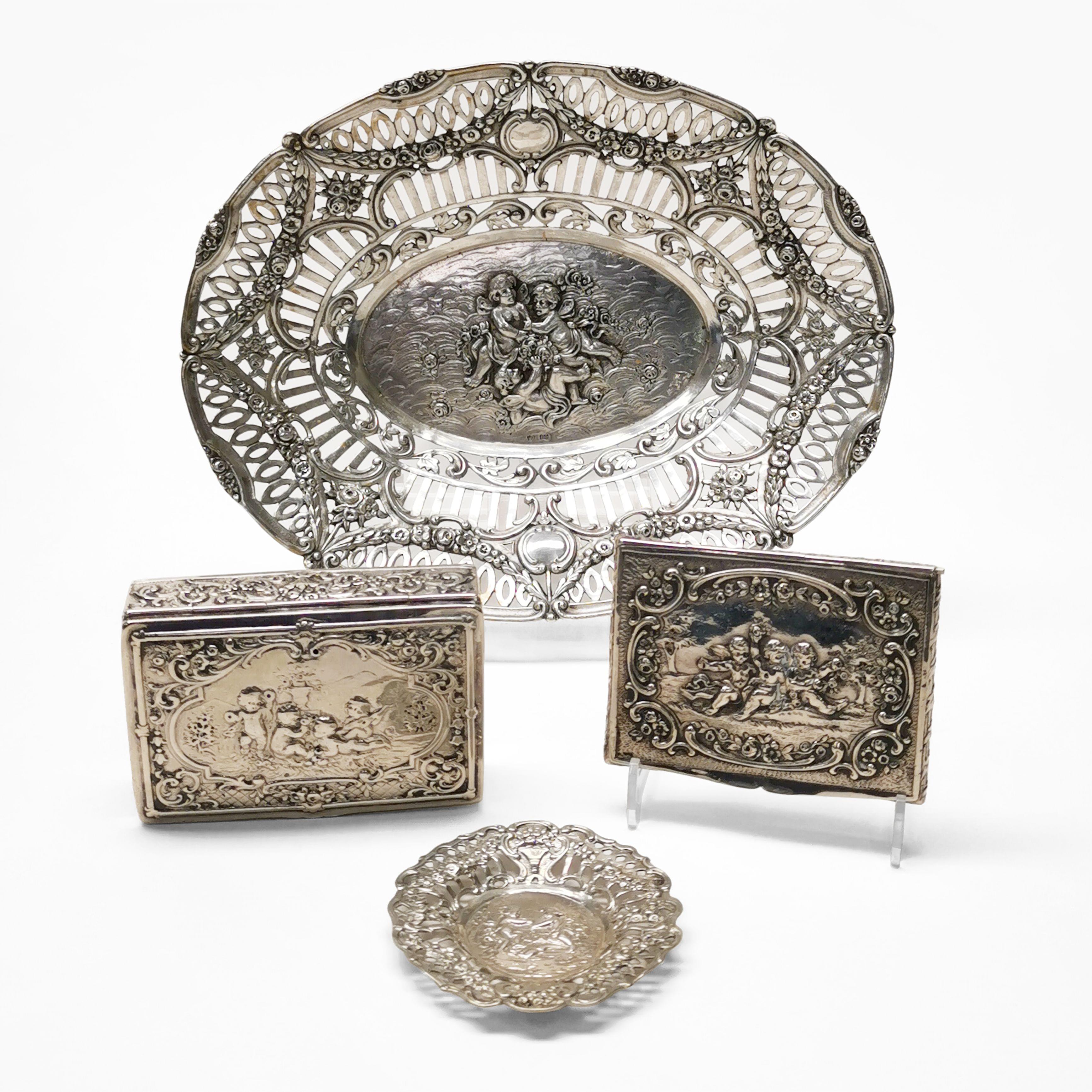 3854. Corbeille, 2 boîtes à décor de Putti et petite coupelle