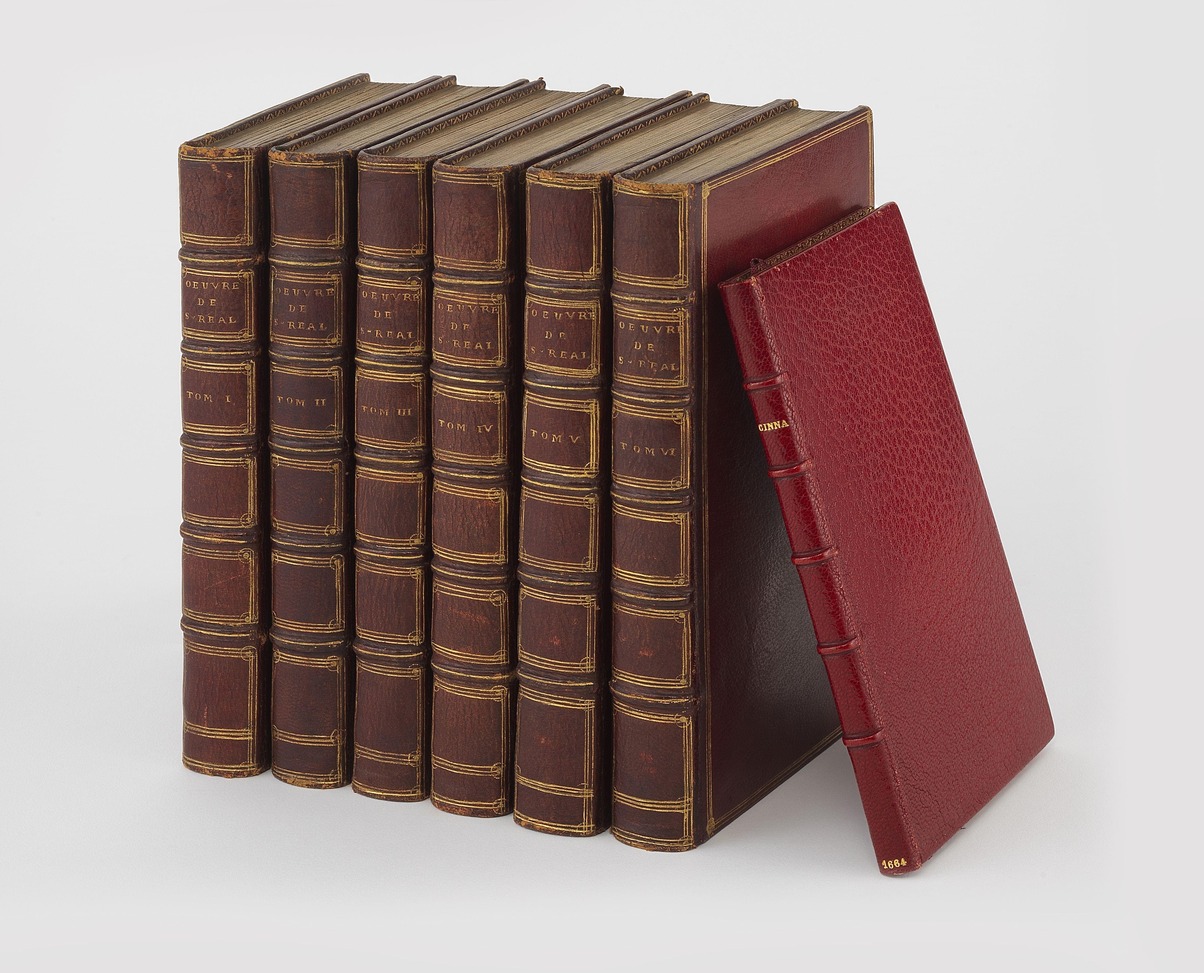 - SAINT-REAL (l’abbé de ) : Oeuvres. Amsterdam, Francois L’Honoré , 1740 ; six vol. in 12, maroquin rouge à décor de filets dorés sur les dos et sur les plats, tranches dorées. Reliure de l’époque. Edition ornée d’un front. répété et deux figures gravées.