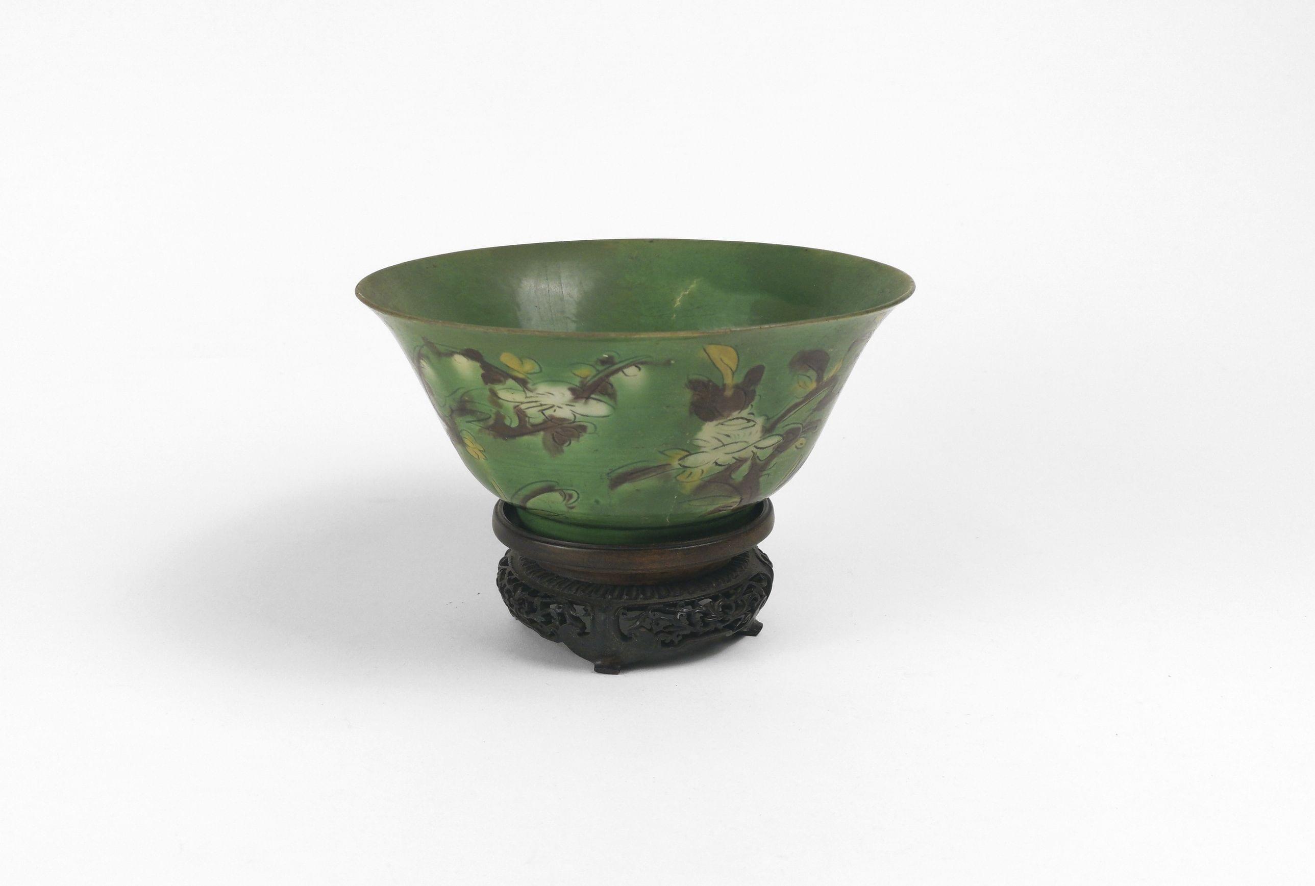 Porcelaine émaillée sancai, décor de fleurs, D 19 cm (restaurée)