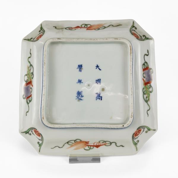 Japon, fin XIXe s, porcelaine émaillée blanc bleu à motif de personnage dans un jardin et bordure polychrome, fausse marque Ming au dos, 19x19 cm