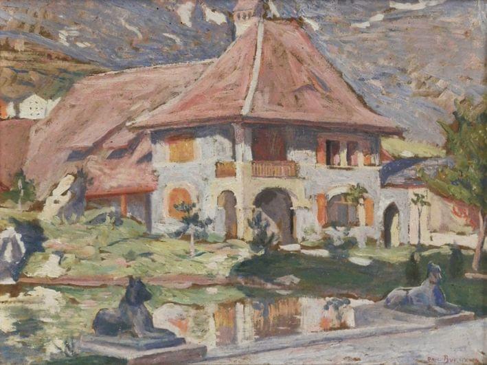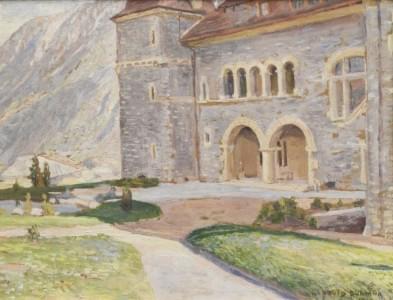 Grande maison et maison du gardien, Pradegg, Sierre, huile sur carton, datée 1910, 27x34 cm