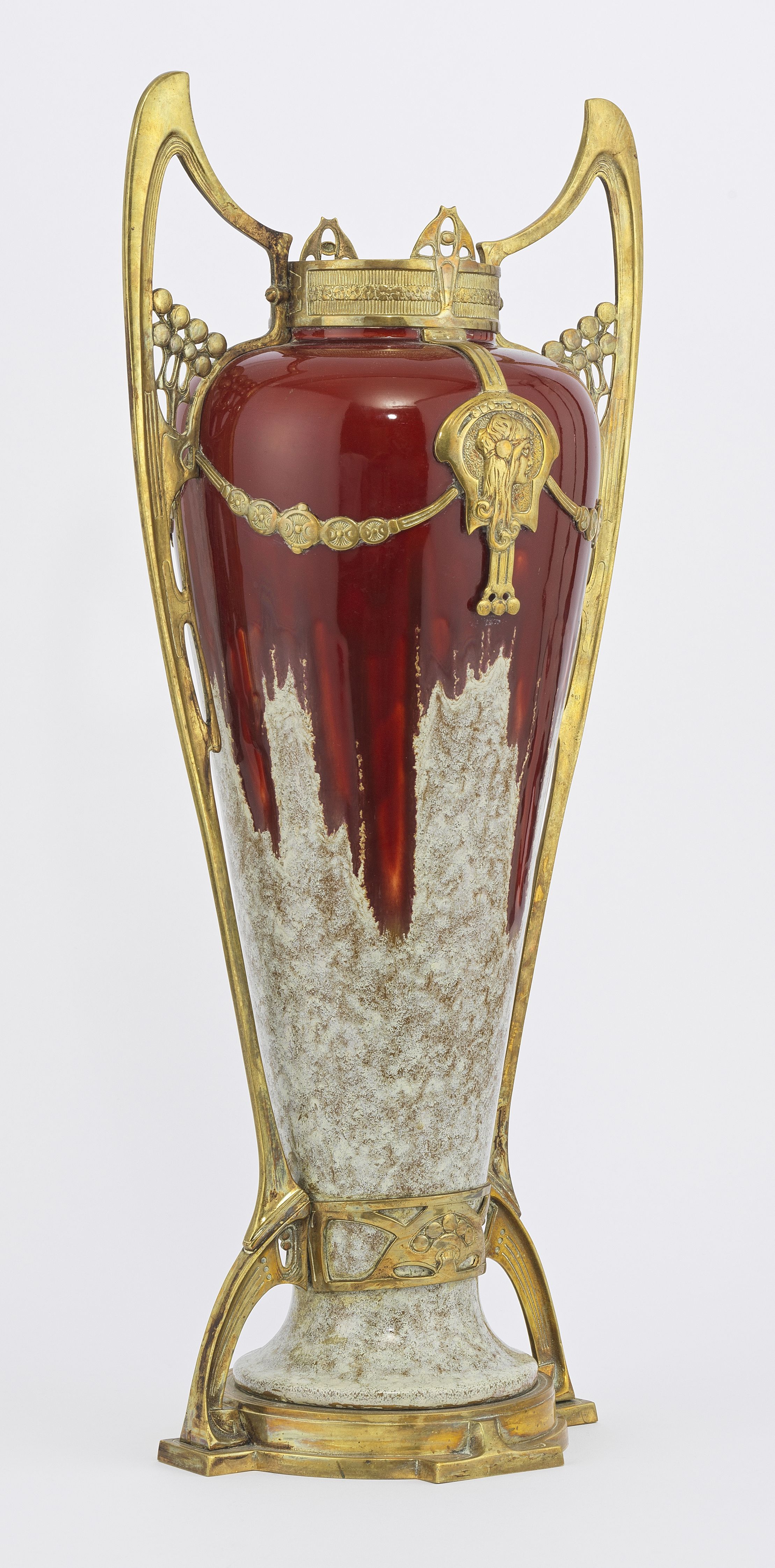 Grand vase Jugendstil, céramique émaillée rouge et blanche, monture en bronze doré et ciselé, H 68,5 cm