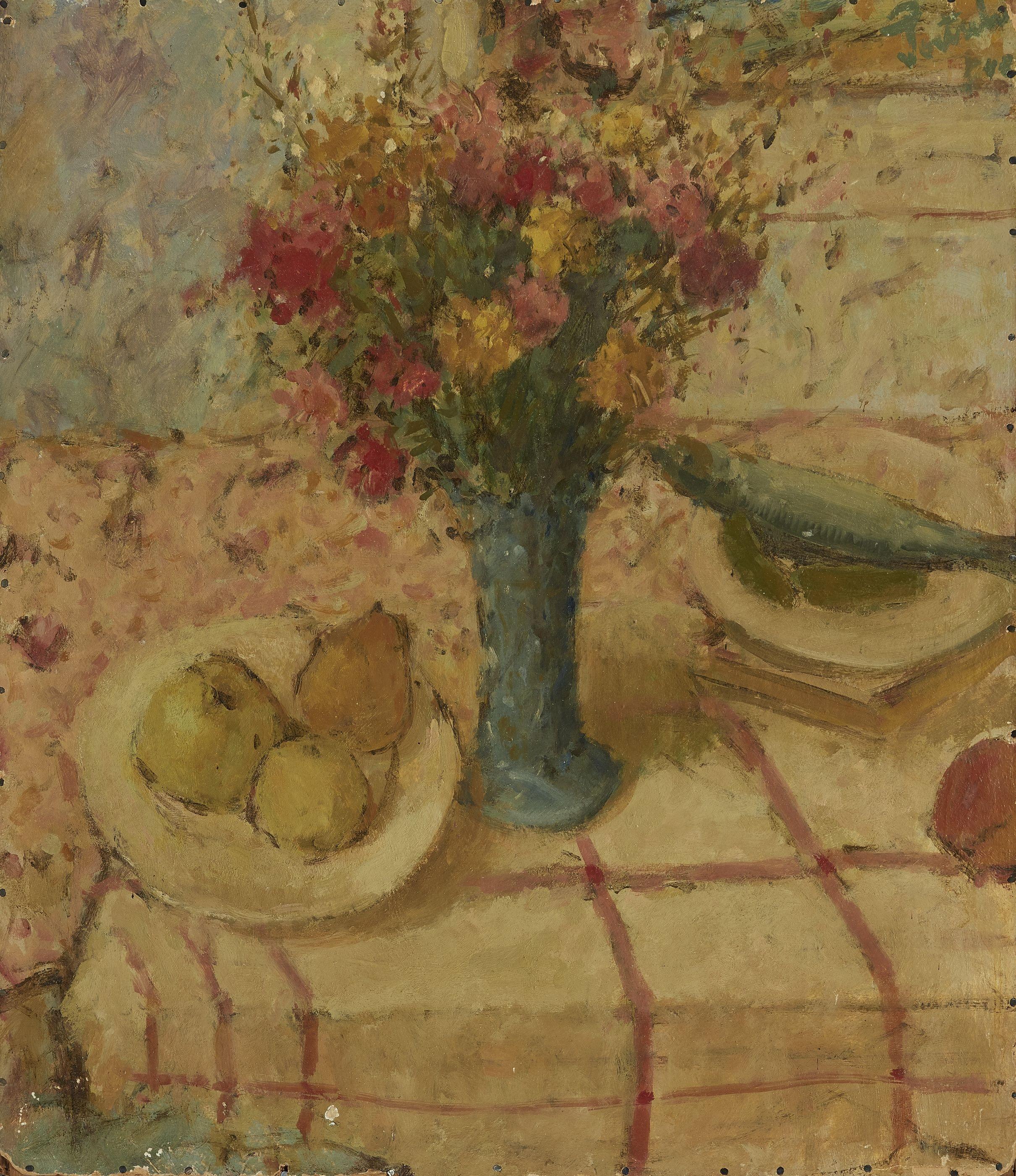 Bouquet de fleurs, fruits et poisson, huile sur carton, 79x69 cm