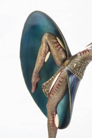 Bronze patiné, peint à froid et argenté, ivoire, base en onyx, porte un cachet Etling Paris au dos, 58x28x12 cm