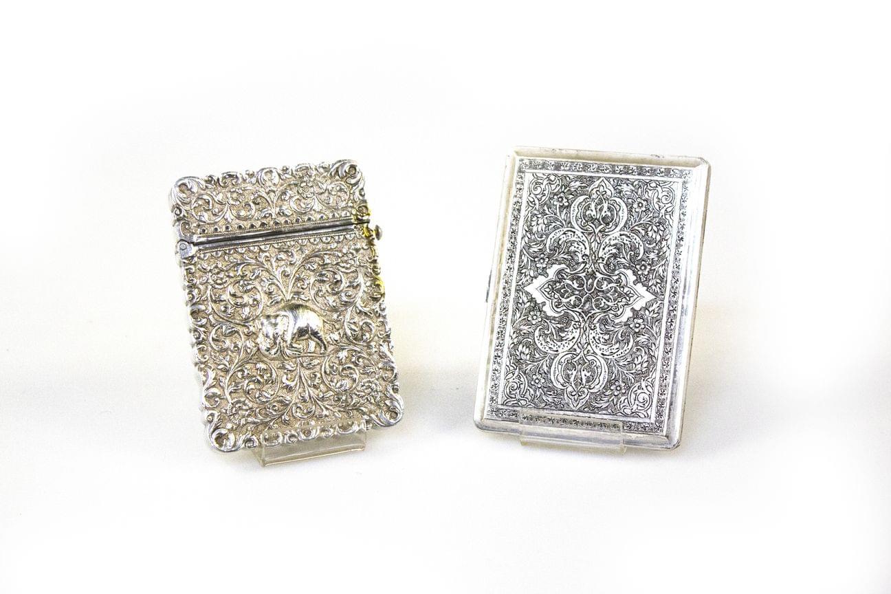 3262. Deux boîtes, une à cartes et une à cigarettes, à décor de rinceaux et éléphant