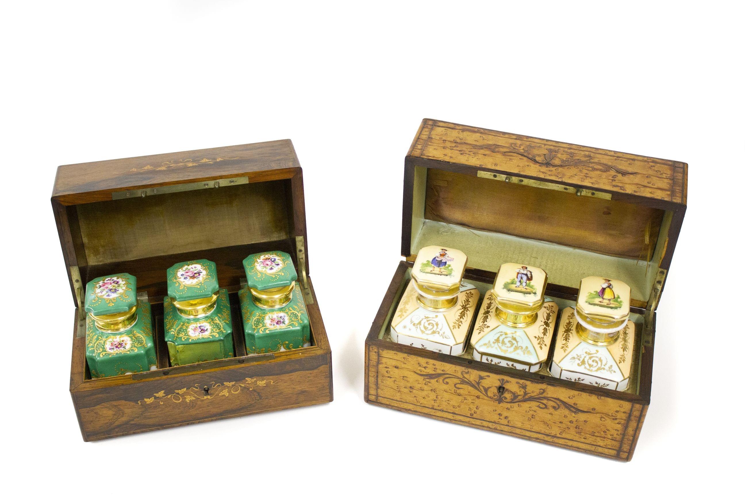 Contenant chacun deux flacons et une boîte en porcelaine, L 26 cm