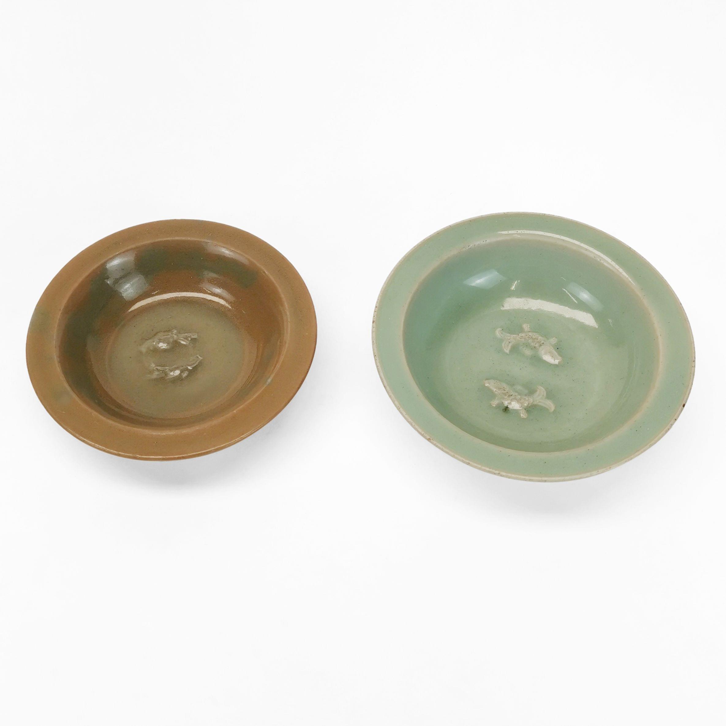 Grès émaillé monochrome vert et marron à décor de poissons en relief, couleur céladon, D 13 cm et D 14 cm