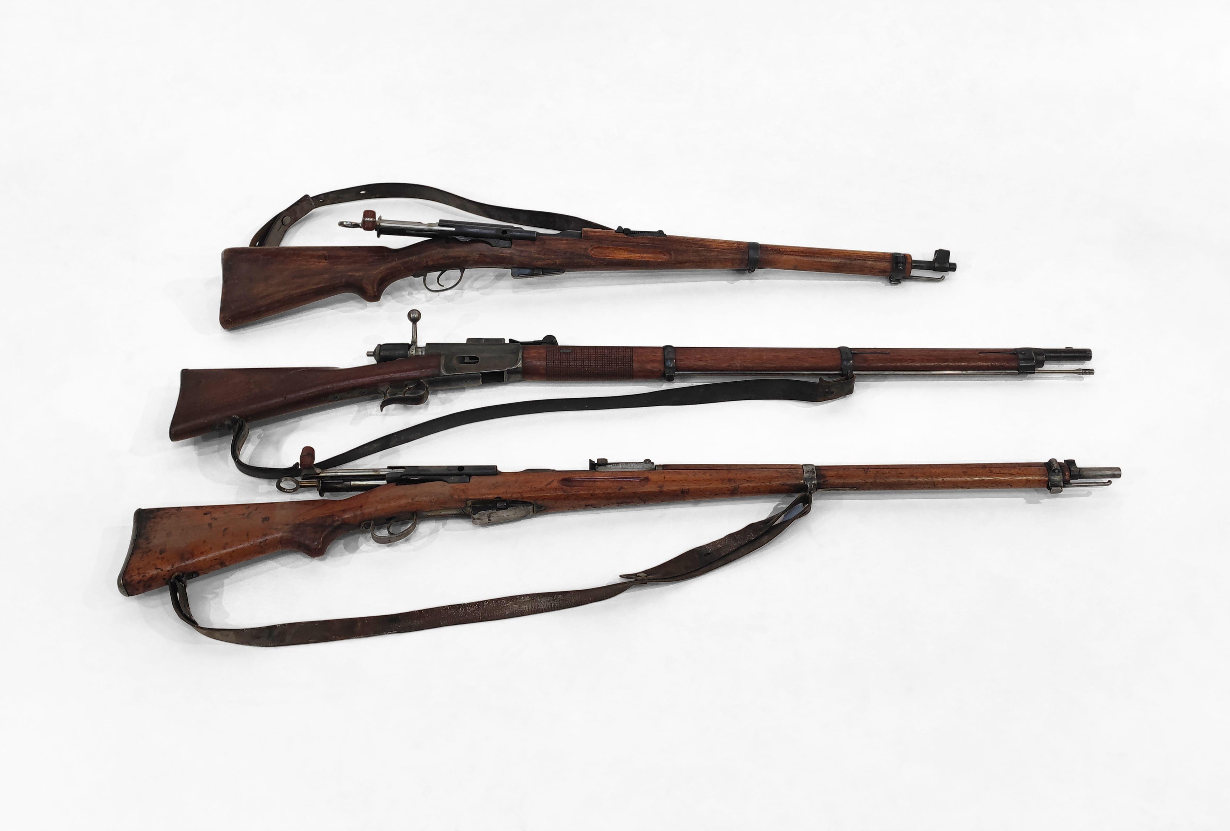 No. 78641 et 239450, L 110 et 130 cm. On joint un fusil Vetterli 1869, calibre 10,4 mm, Waffenfabrik, Bern No.130255, L 130 cm