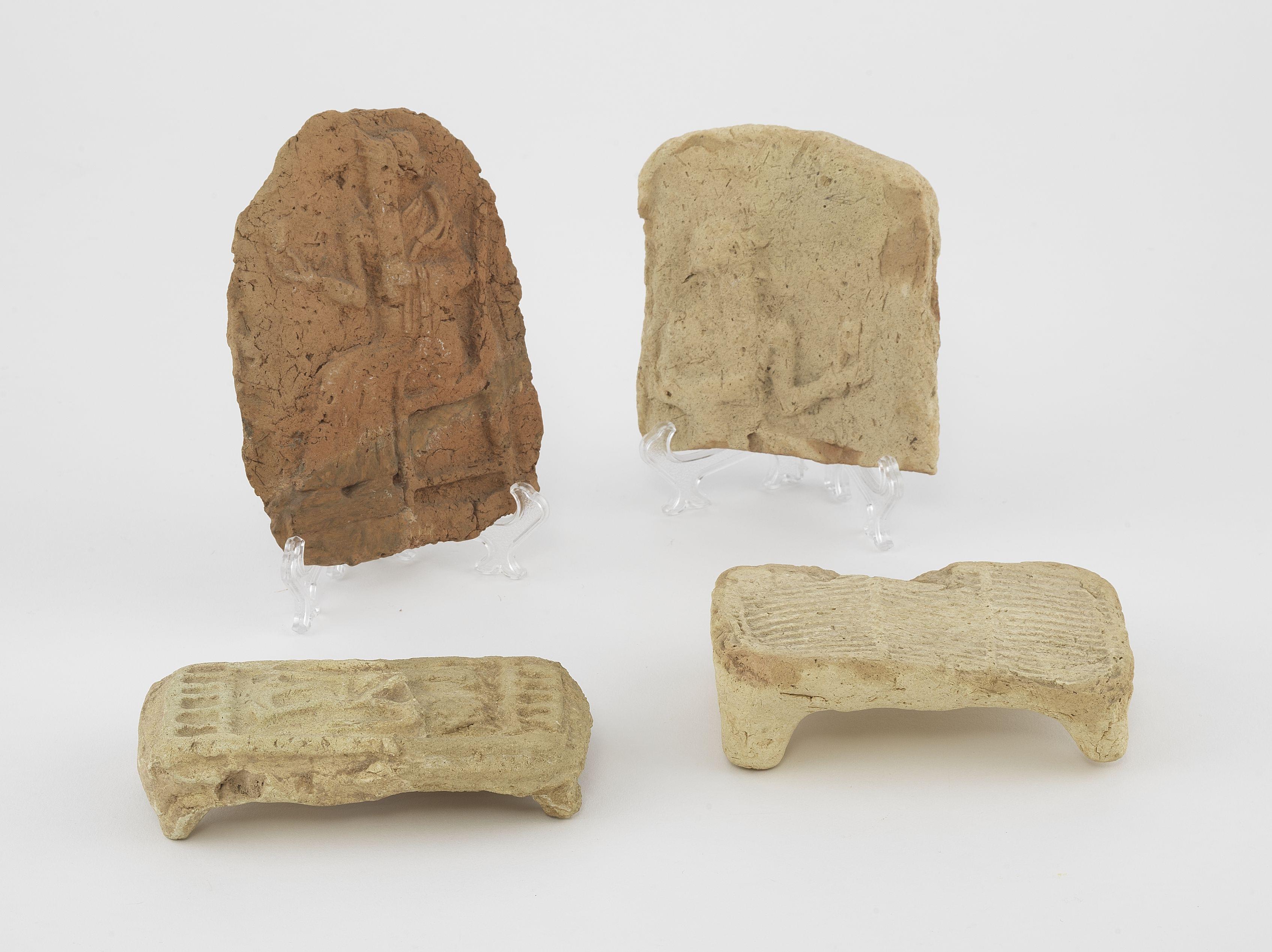 4809. Deux modèles de lit et deux fragments de plaque figurant des rois guerriers, Mésopotamie, paléo-babylonien (2004 à 1595 av.JC)