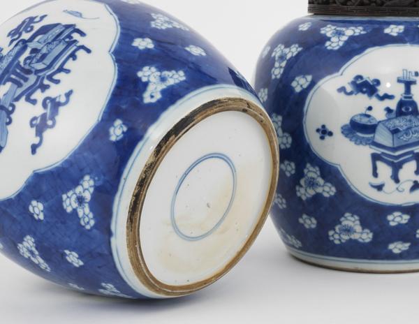 Porcelaine émaillée bleu blanc à motifs d'objets dans des réserves, H 22 cm