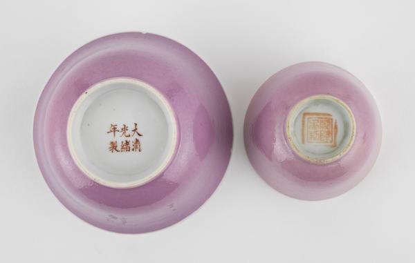 Porcelaine émaillée monochrome rose, l'une avec une marque Guangxu en rouge fer sous la base,
