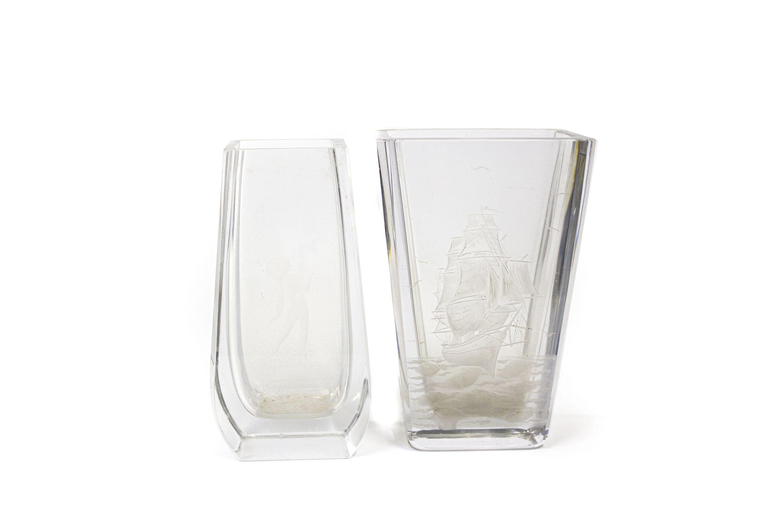 Verre gravé, l'un à décor d'un voilier et l'autre à décor d'un enfant, H 17 et 18 cm
