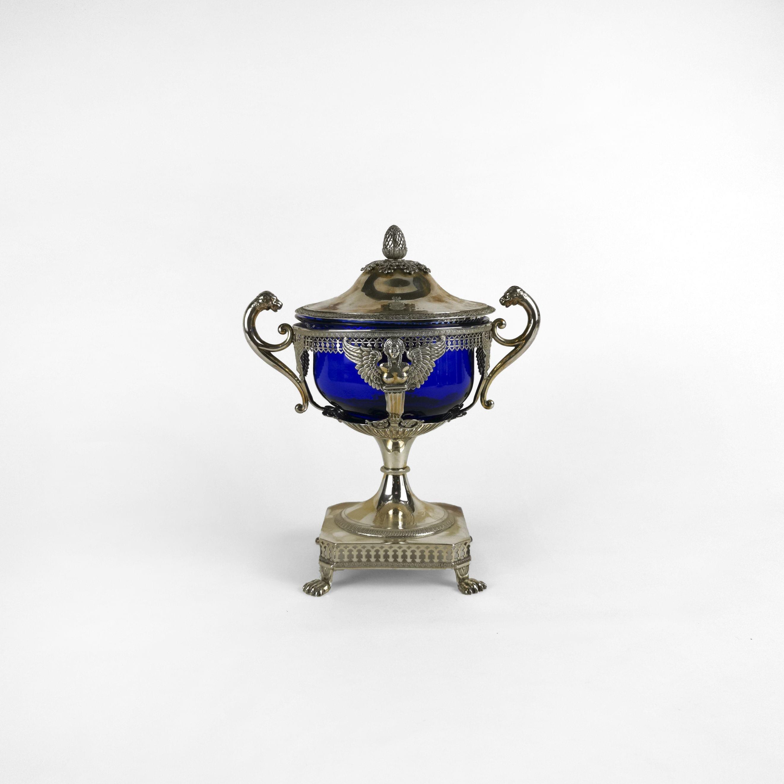 France, argent et verre bleu postérieur, H 23 cm, 450 g