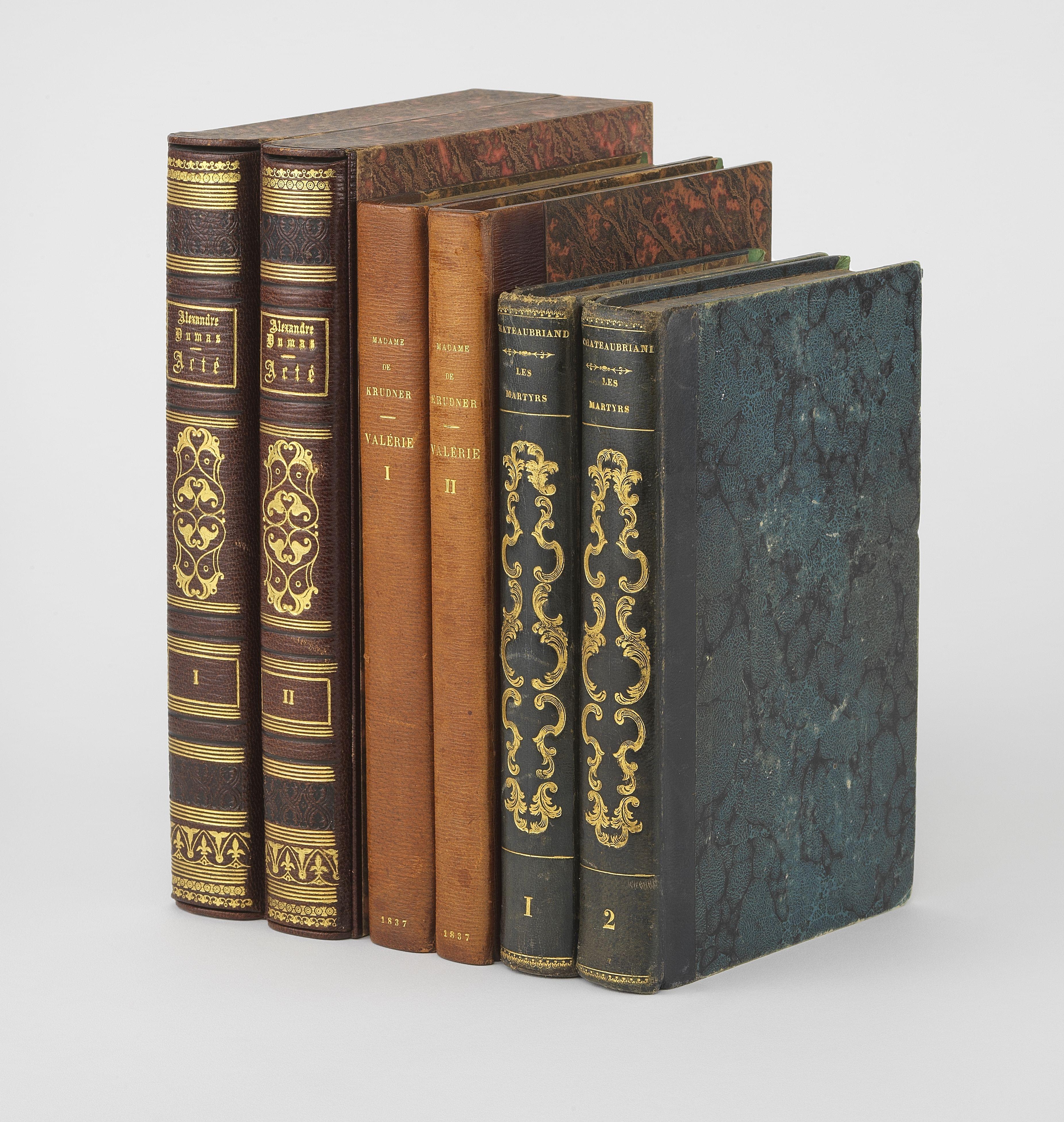 - KRUDNER (Mme) : Valérie. Paris, Olivier, 1837 ; deux vol. in 8°, demi-chagrin. - CHATEAUBRIAND (François-René) : Les Martyrs. Paris, Le Normant, 1809 ; deux vol. in 8°, demi-basane bleue ornée. Edition originale.
