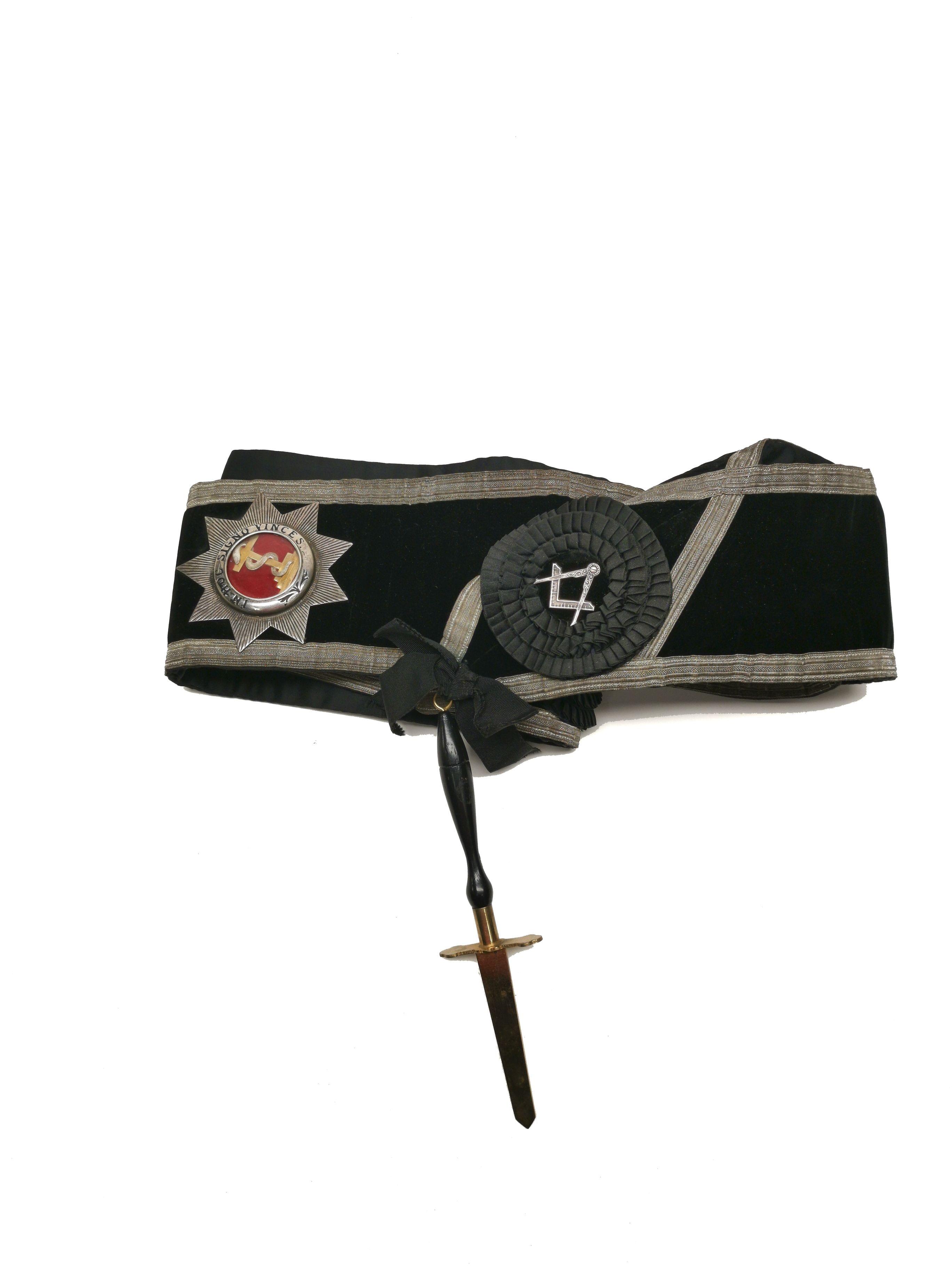Velours noir, galon d'argent et pièces d'argent à motif de croix et médaillon étoilé, L 106 cm89