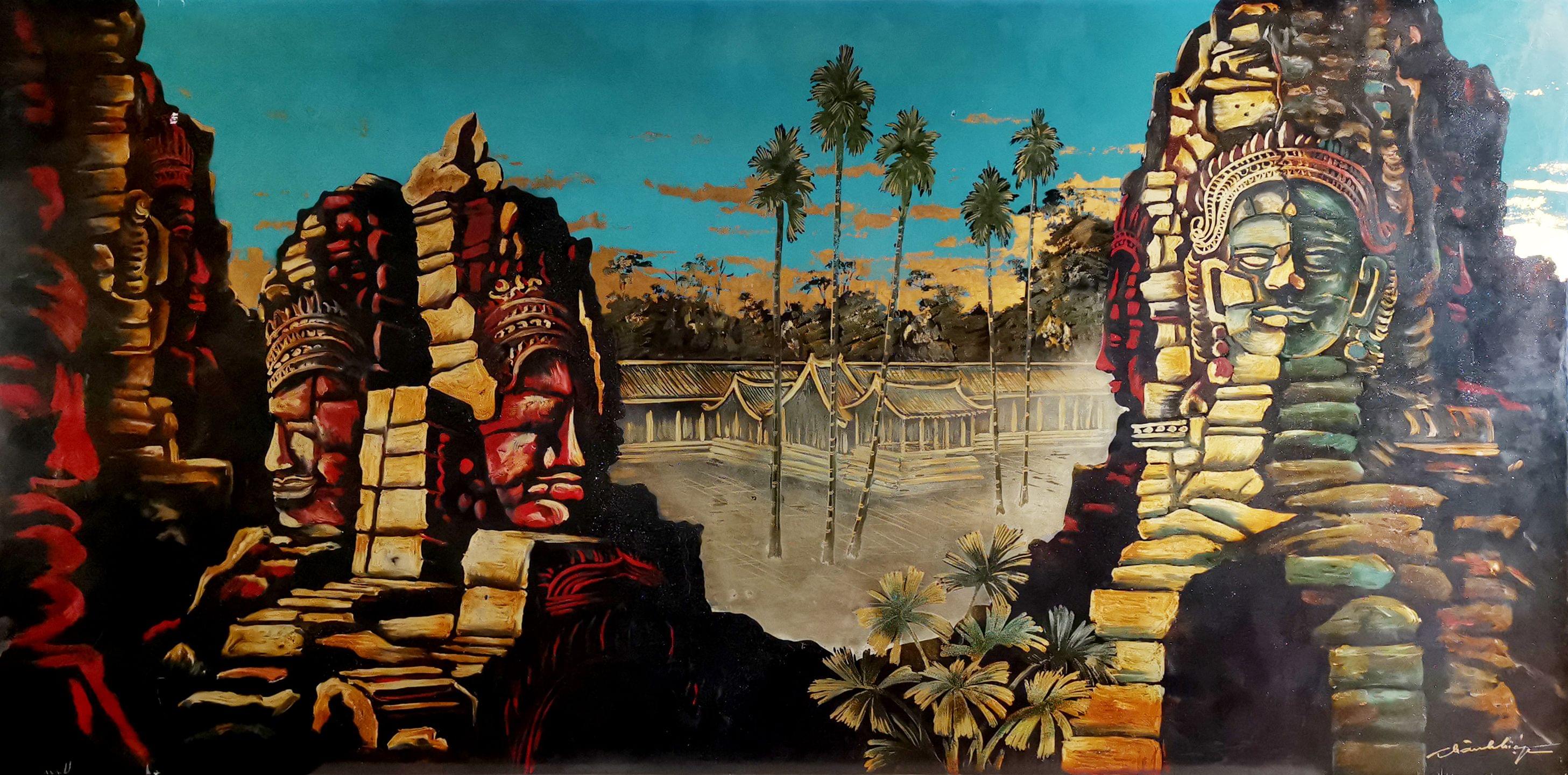 Paysage avec ruines, panneau en bois laqué et peint, signature illisible, 60x122 cm