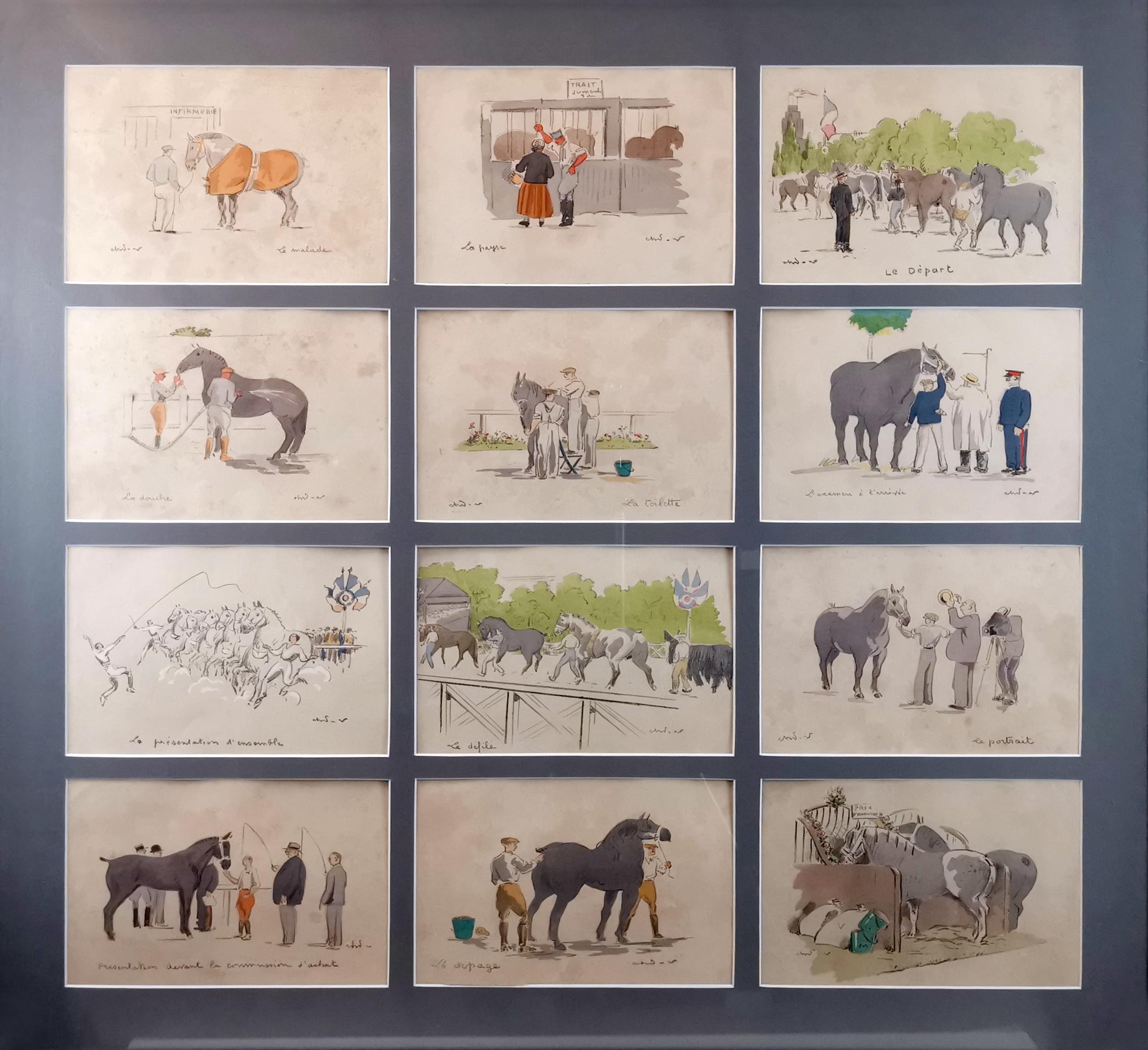 Ensemble de 12 lithographies sur le thème du cheval, monogrammées, chacune 18x27 cm