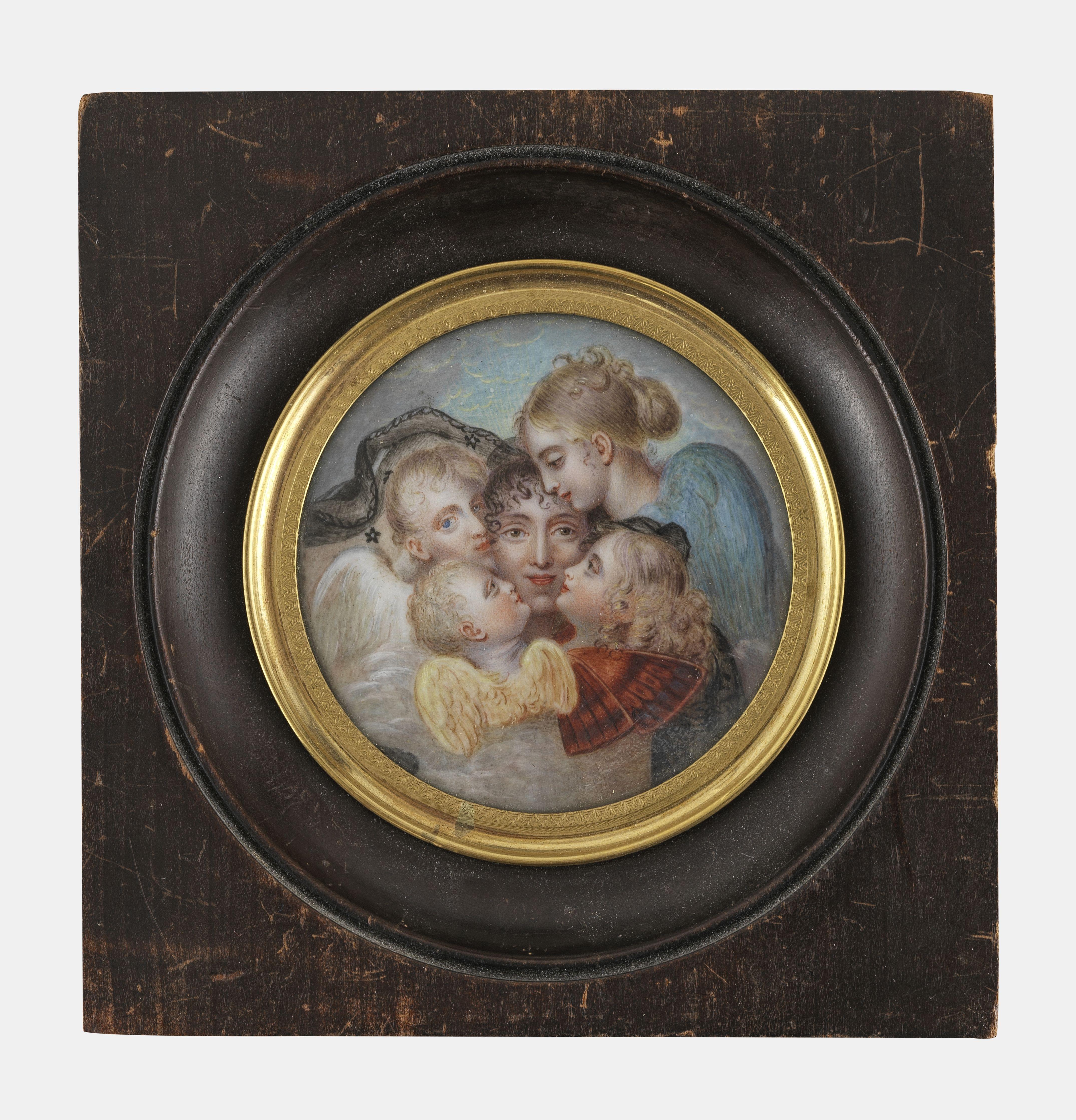 Femme et quatre séraphins, miniature à la gouache, D 7 cm
