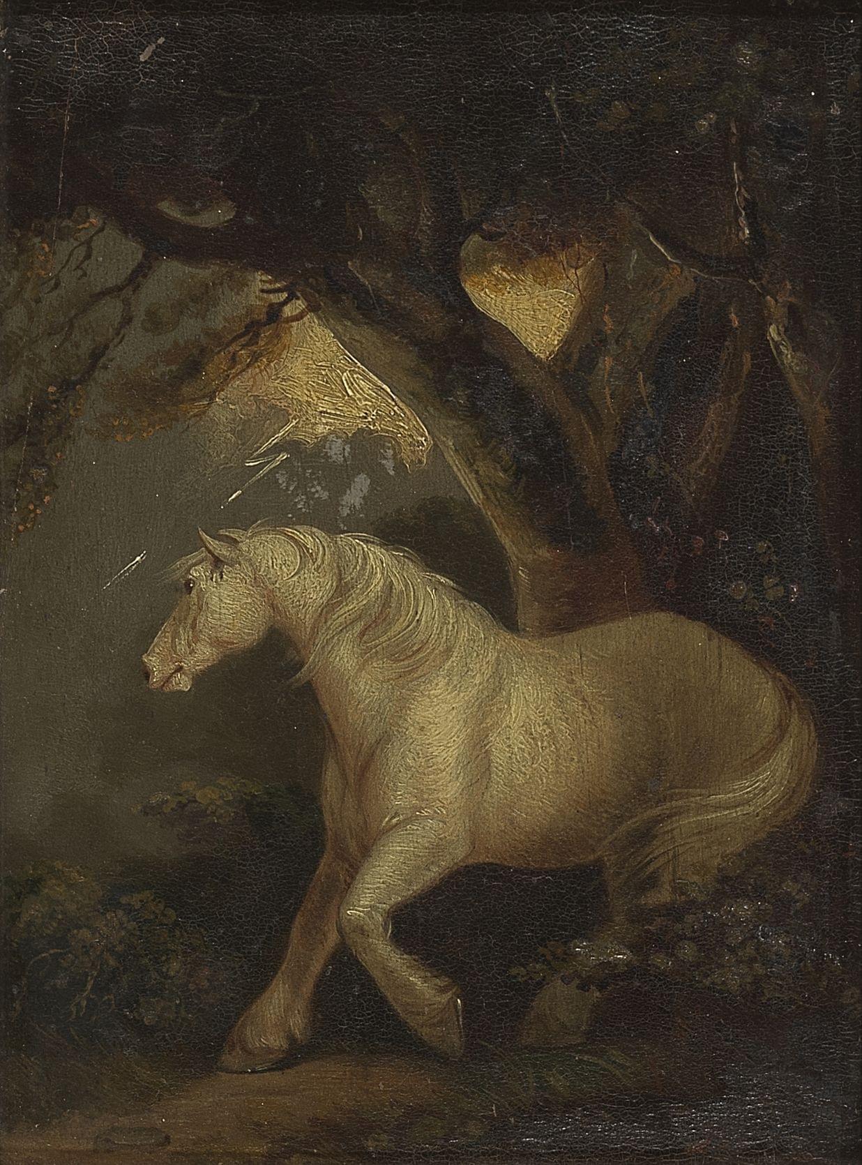 Poney sous un arbre pendant l'orage, huile sur panneau, 21x16 cm