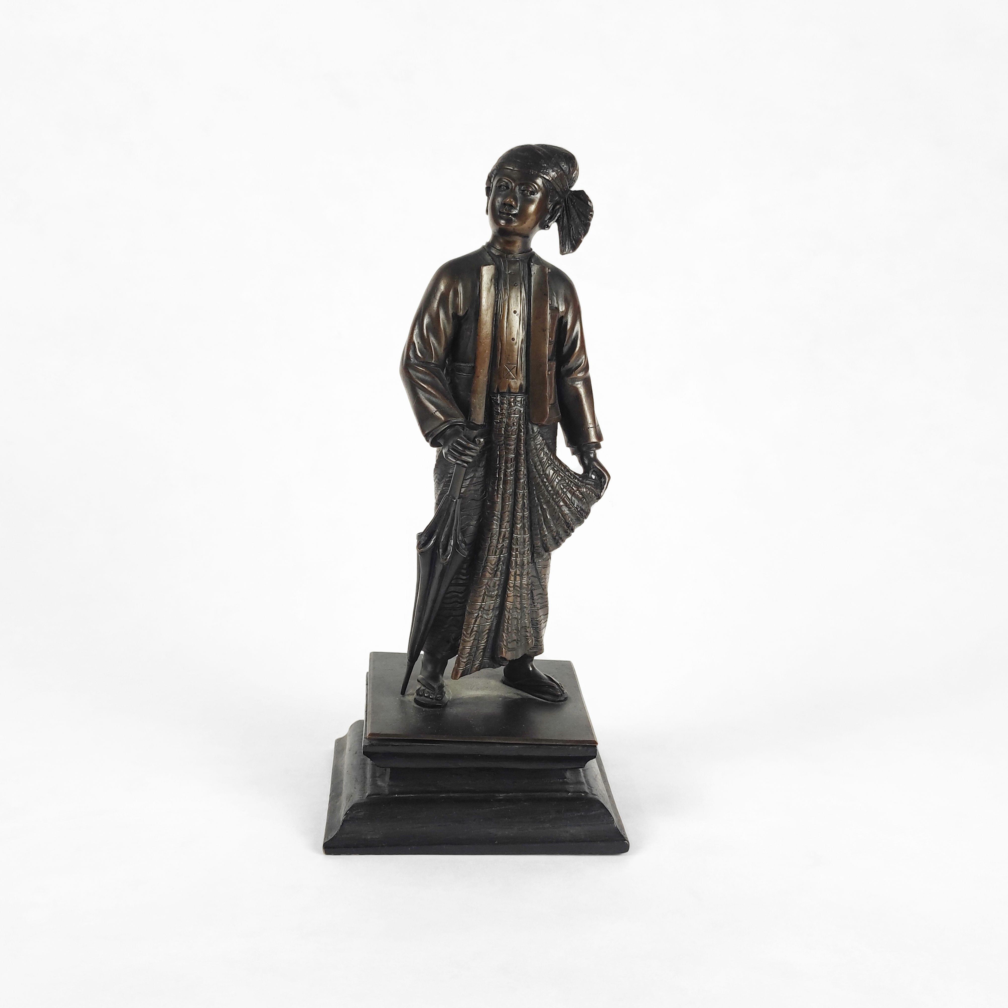 Jeune asiatique au parapluie, bronze à patine brune, H 22 cm
