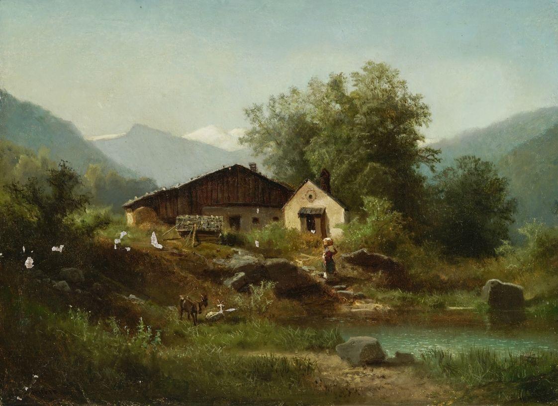 Femme au bord de la mare, huile sur toile, 42x58 cm