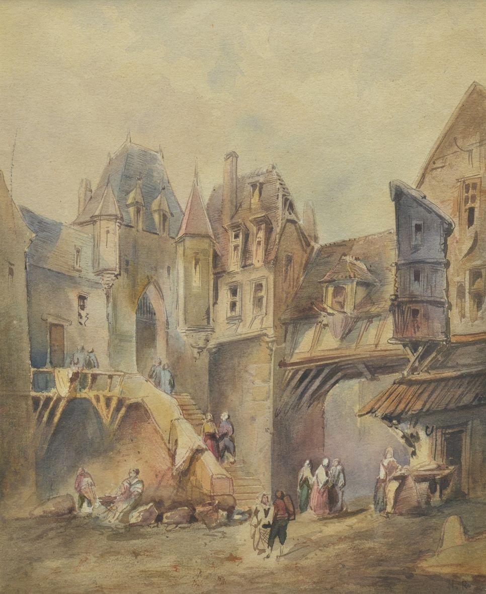 Porte de ville animée, aquarelle sur papier monogrammée H.R., 28 x 23 cm