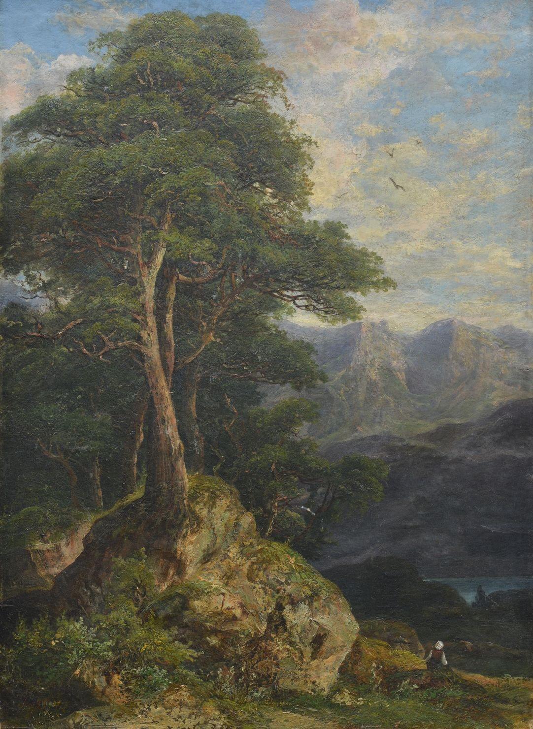 Grand pin et personnage dans un paysage, huile sur carton signée, 49 x 35 cm