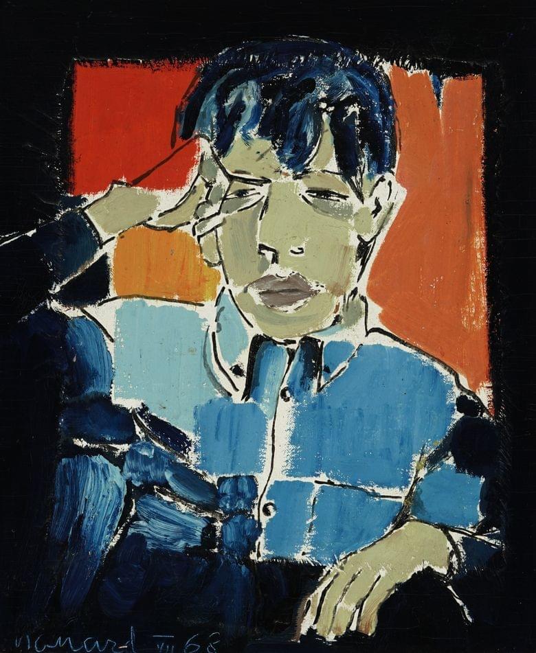 Portrait d'un jeune homme, huile sur toile marouflée sur panneau, signature non identifiée et datée 68, 49x40 cm