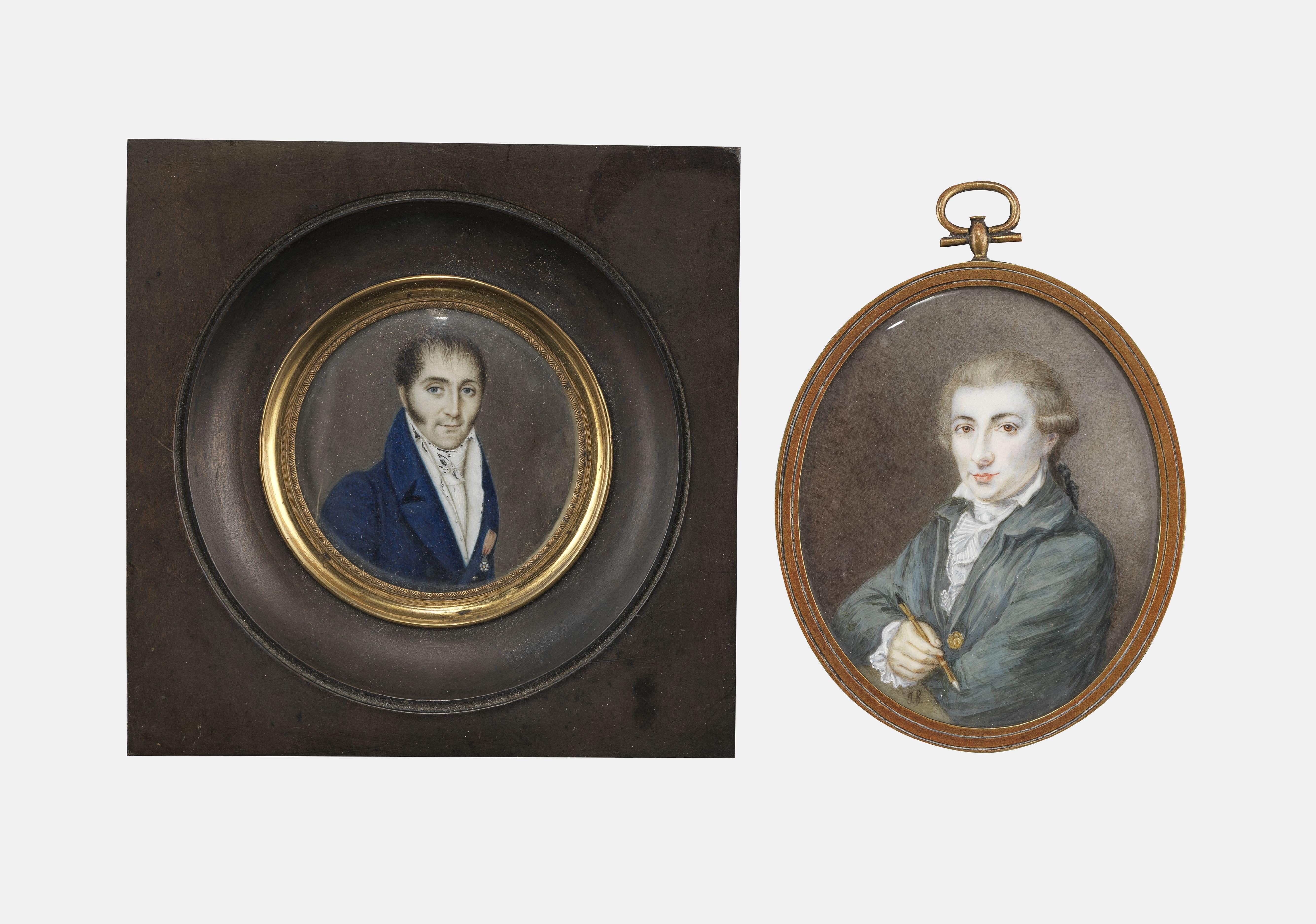 Ecrivain et homme à la veste bleue, deux miniatures à la gouache, 5 et 8 cm