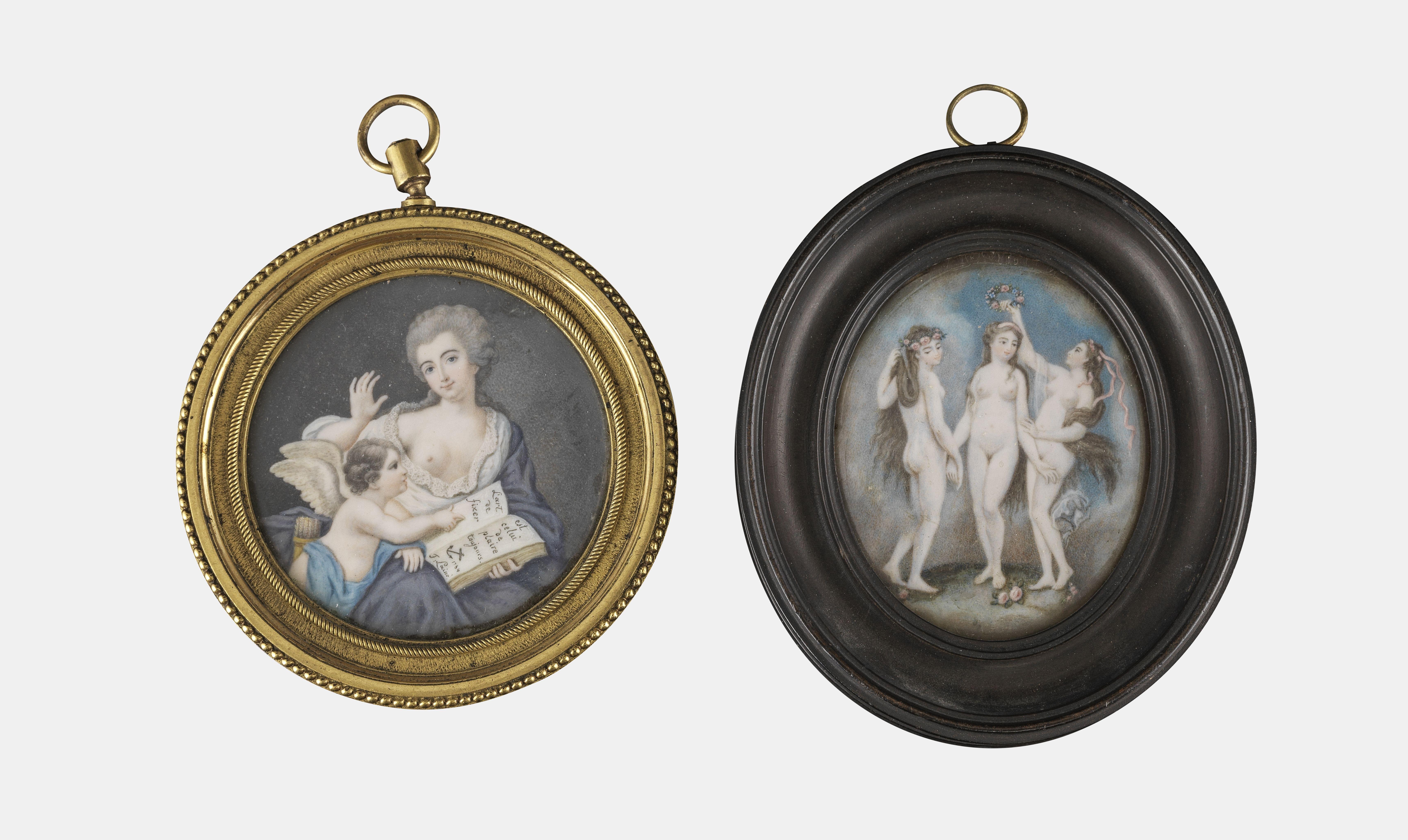 Femme et Amour, miniature à la gouache signée F Lainé, D 5,5 cm. On joint une miniature représentant les Trois Grâces, 6x5 cm.