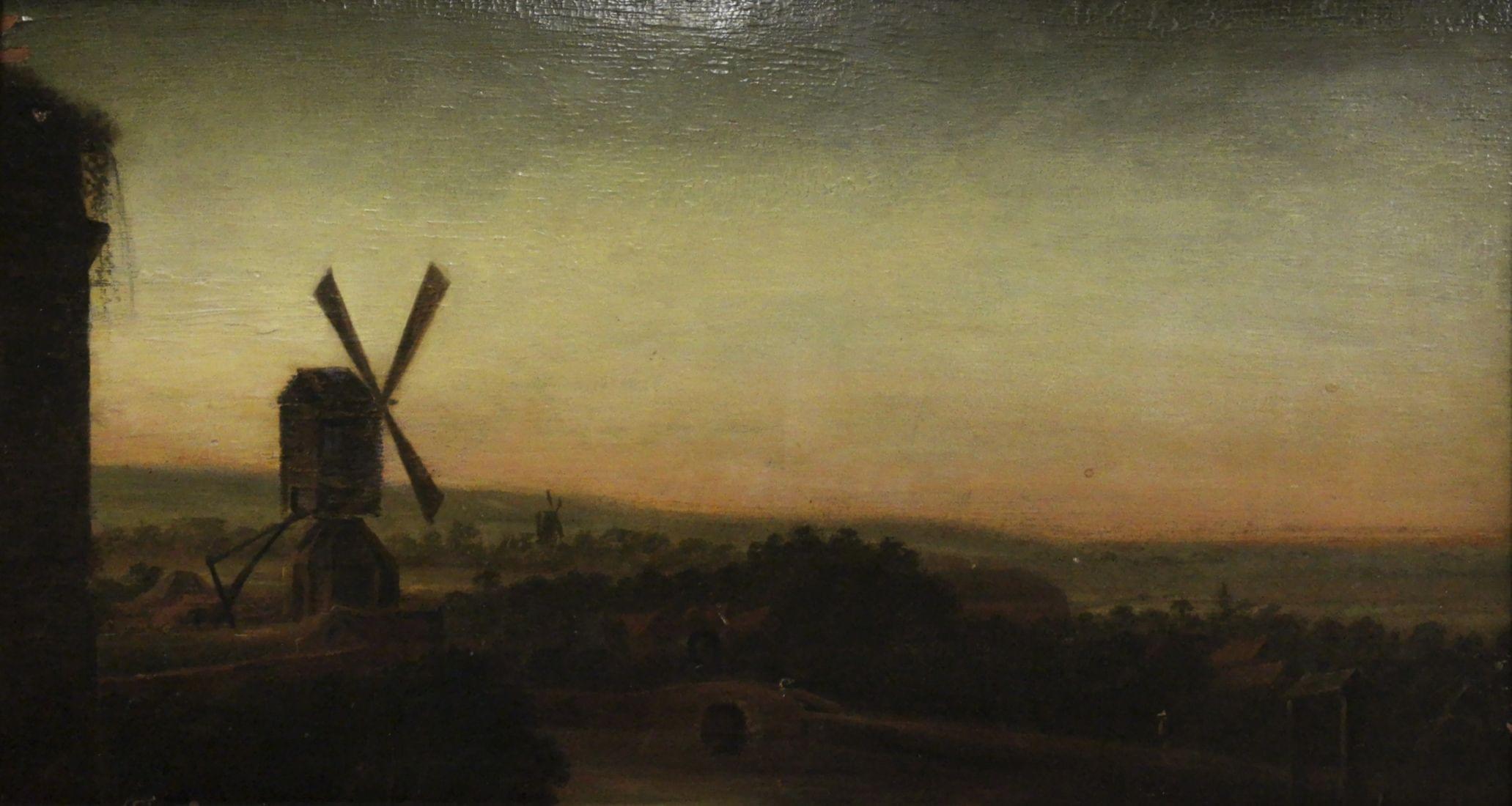 Paysage aux moulins, huile sur panneau, 28x52 cm