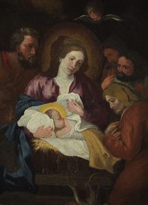 L'adoration des bergers, huile sur toile, 28x21 cm. Cadre en bois sculpté et doré.