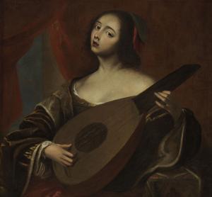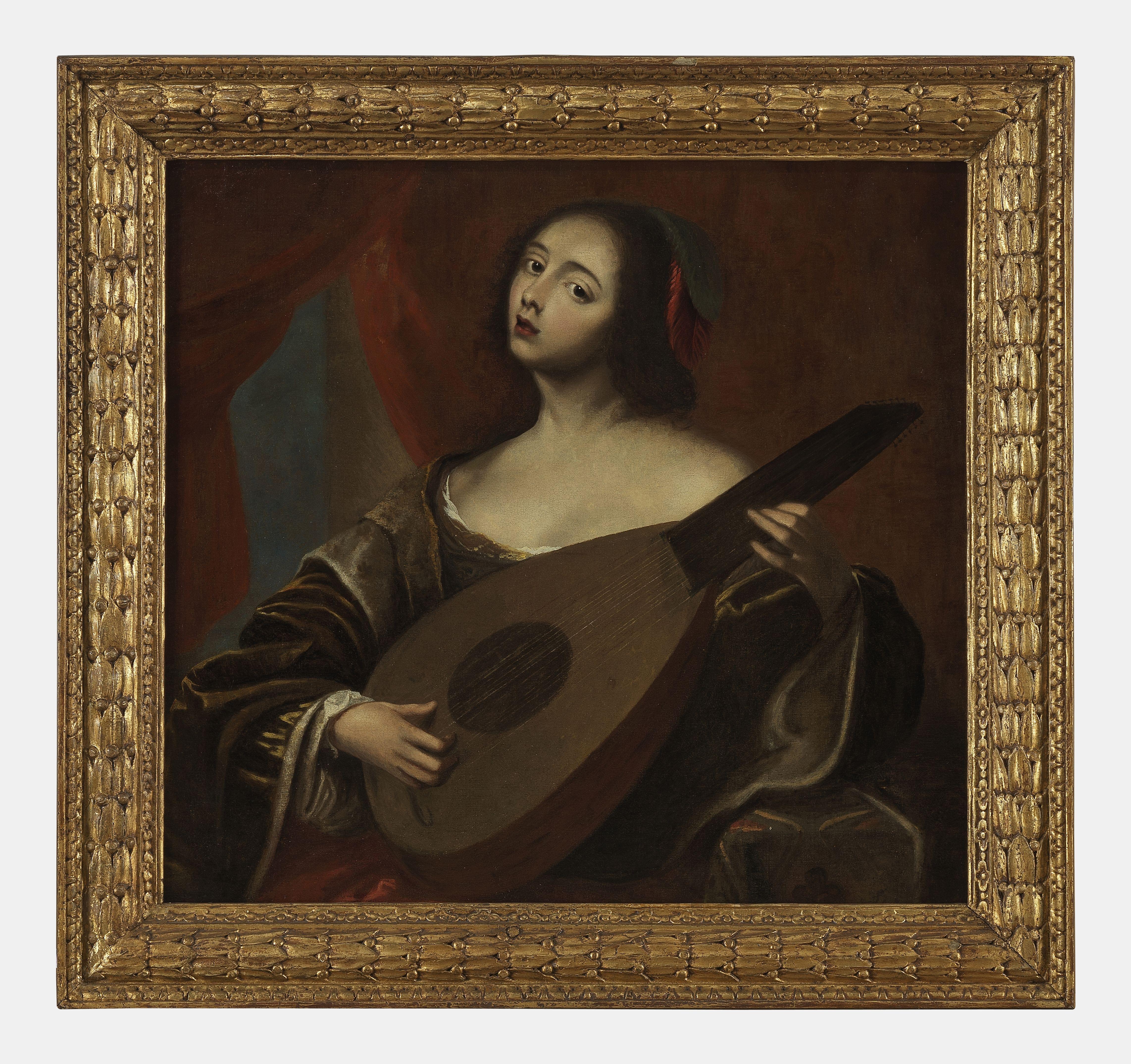 Joueuse de luth, huile sur toile, 78x86 cm. Cadre en bois sculpté et doré à motif de feuilles de laurier.