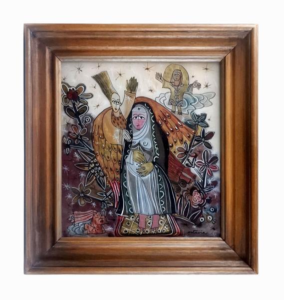 Annunciacion, peinture et dorure sous verre, signée,30x27 cm
