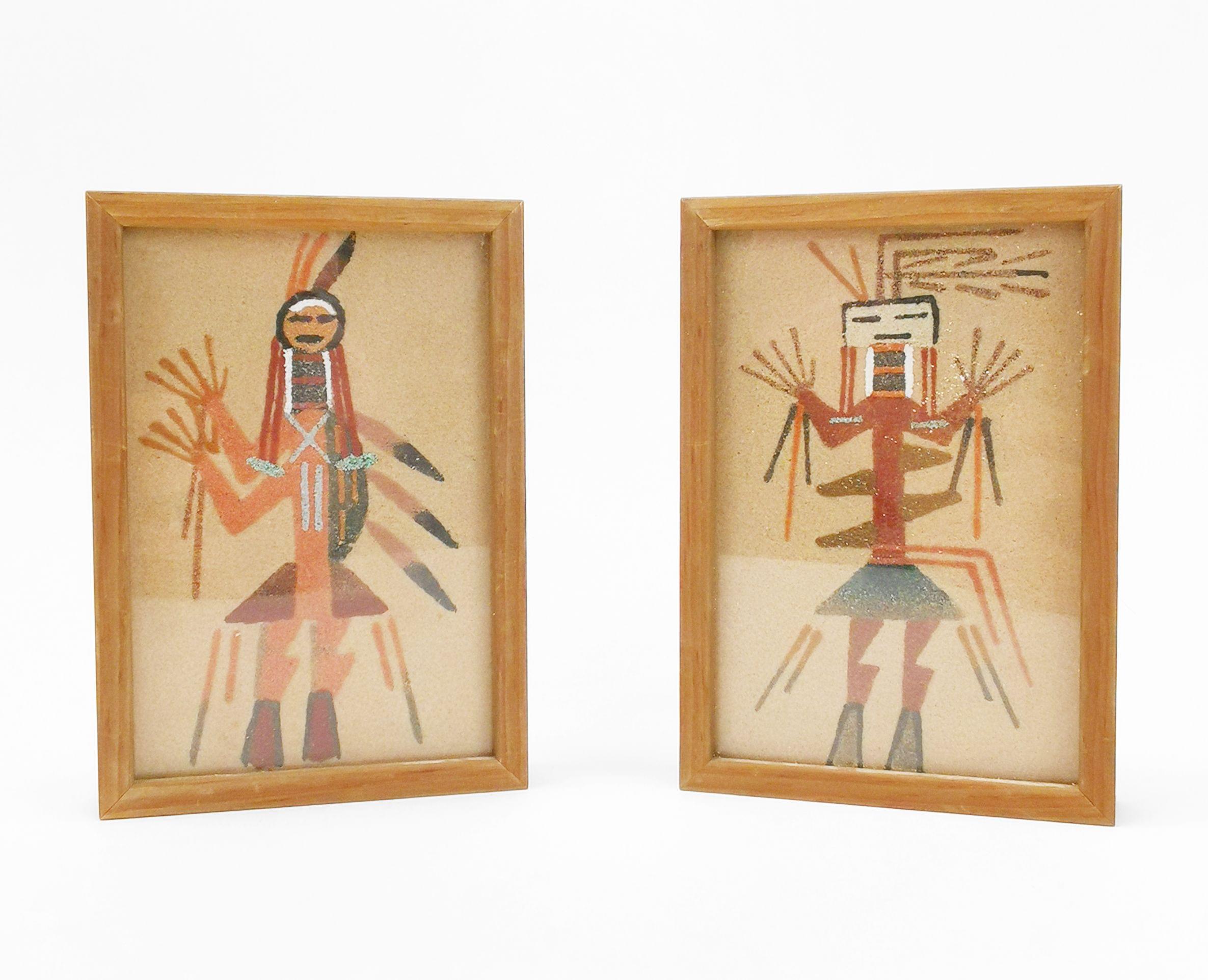 Paire de personnages anthropomorphes, turquoise, sable et pigments sur panneau, 14x10 cm