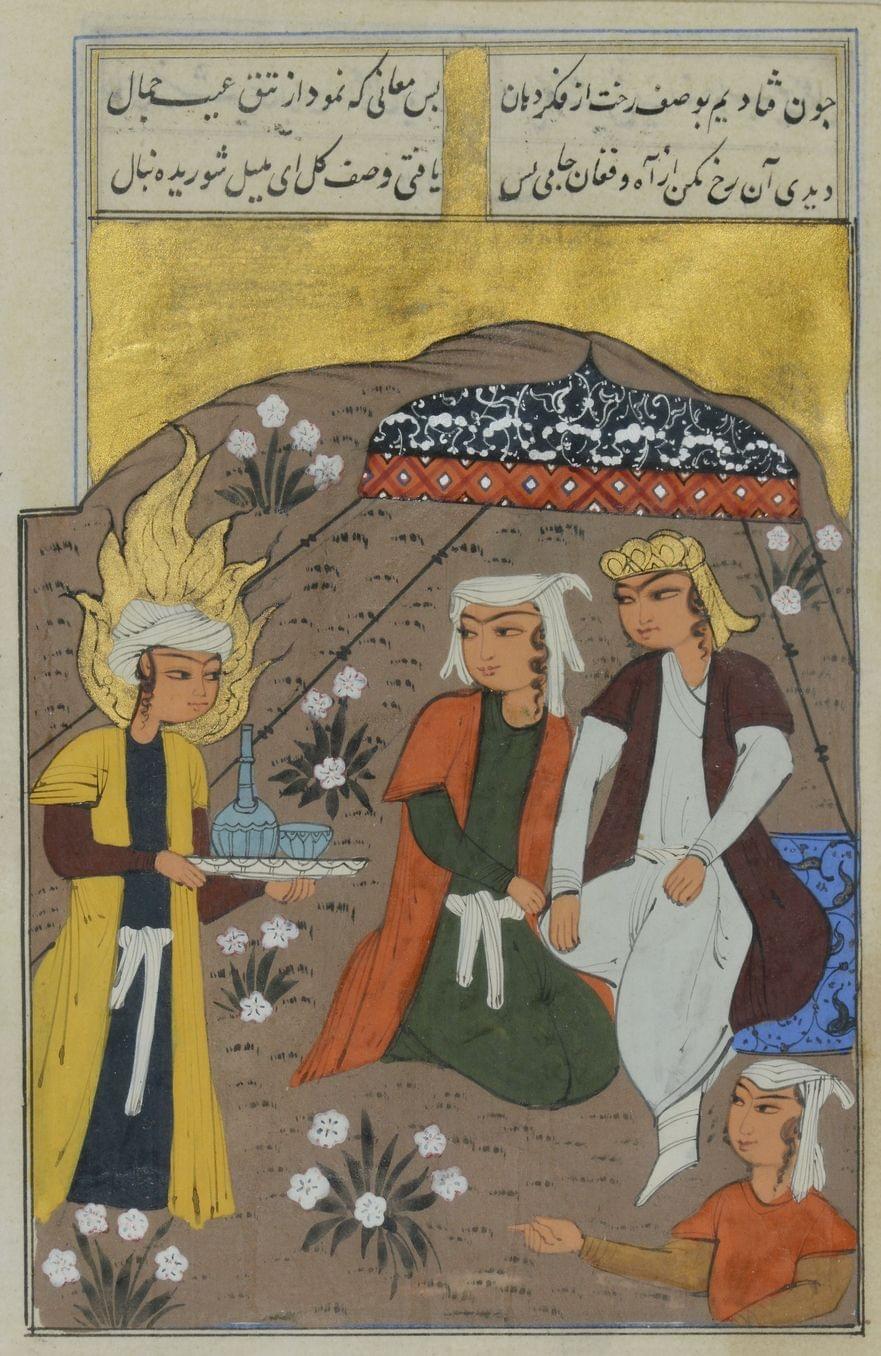 Dignitaire et serviteur, paire de miniatures sur papier, 15x10 cm