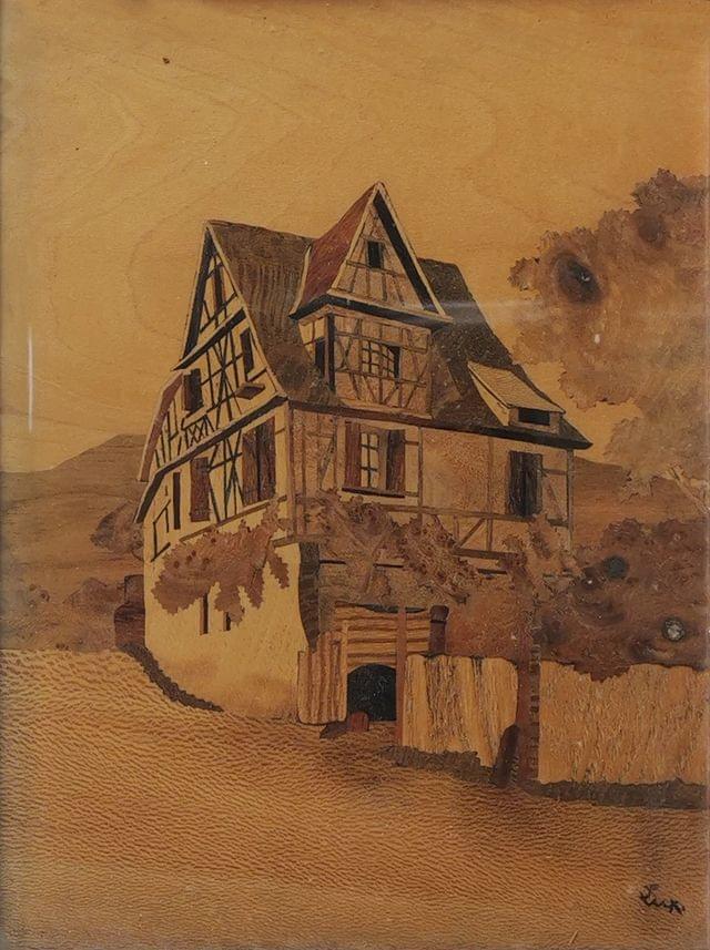 Chalet, bois marqueté, signé Lux, 32x24 cm