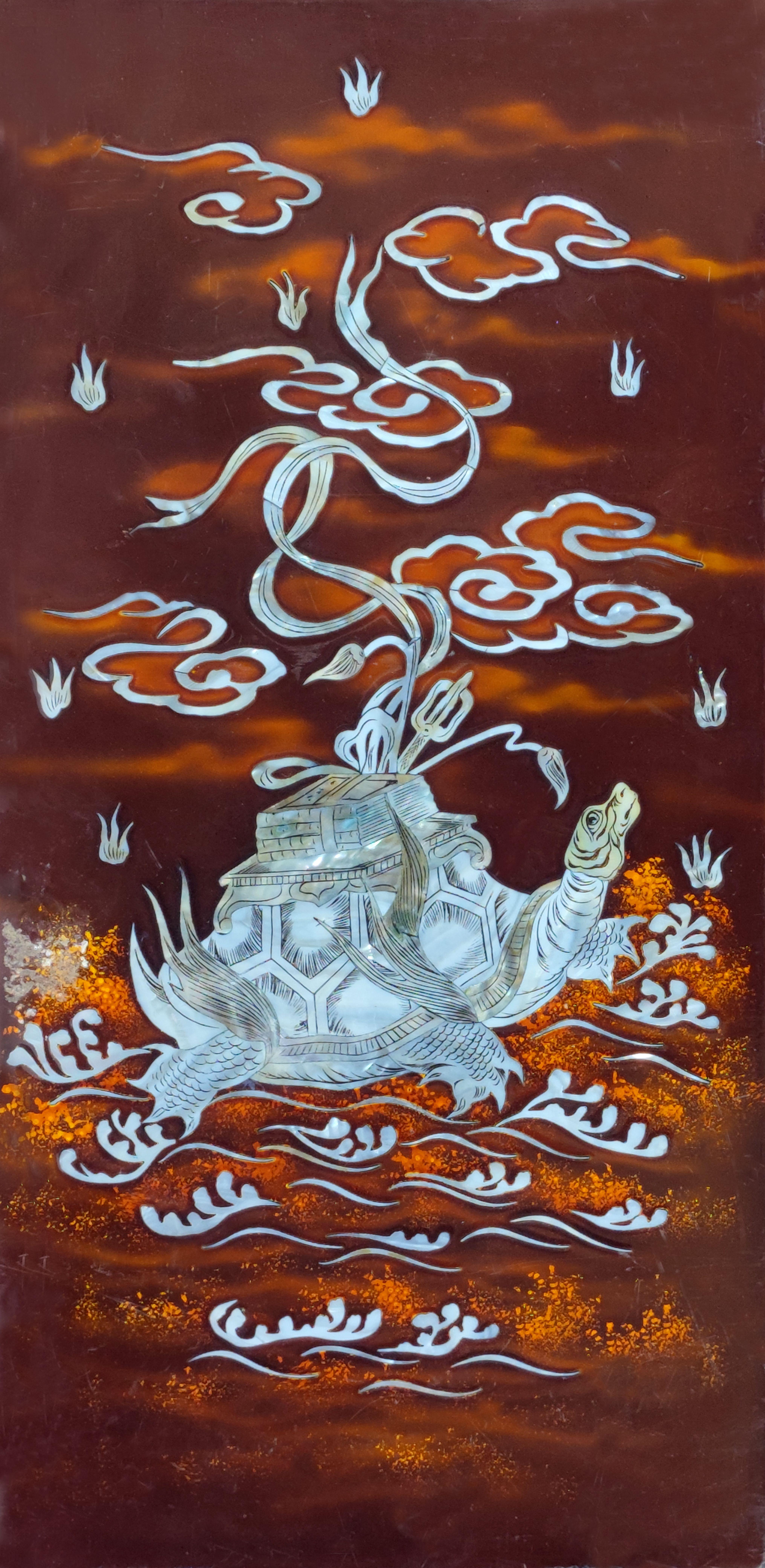 Bois laqué et incrusté de nacre à décor d'un dragon, 59x28 cm