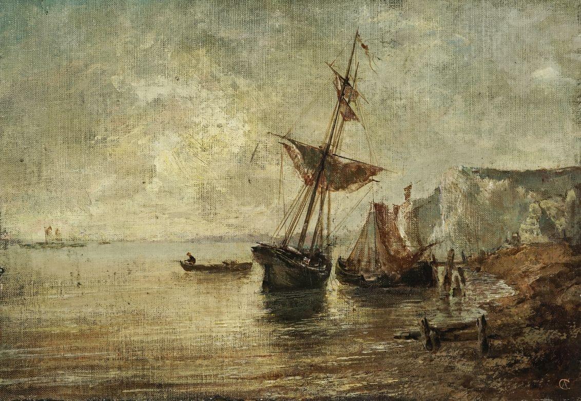 Bateaux échoués, huile sur toile, monogrammée CA, 34x49 cm