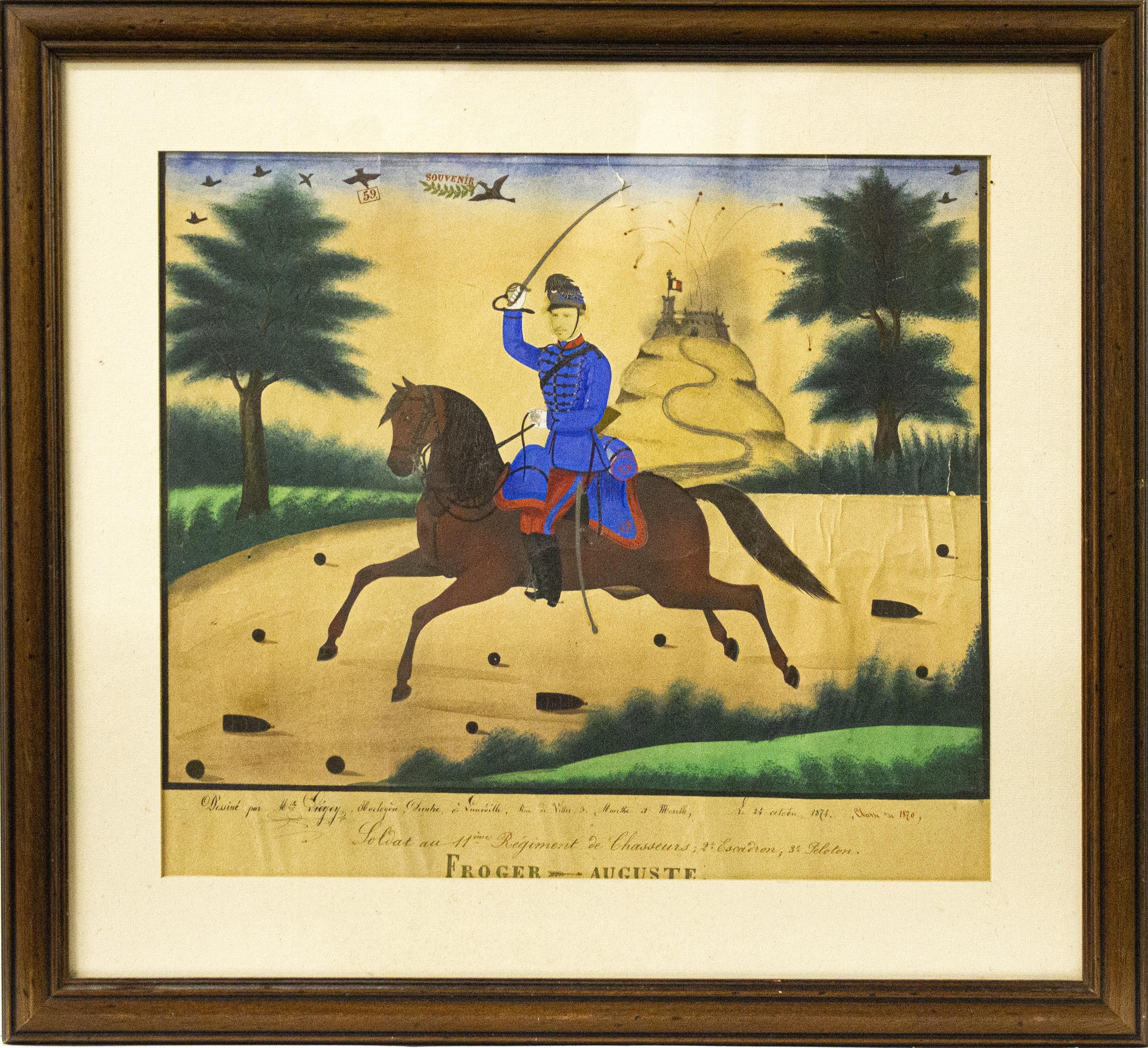 Souvenir d'un soldat au 11e régiment de chasseurs, technique mixte sur papier, 34x38 cm