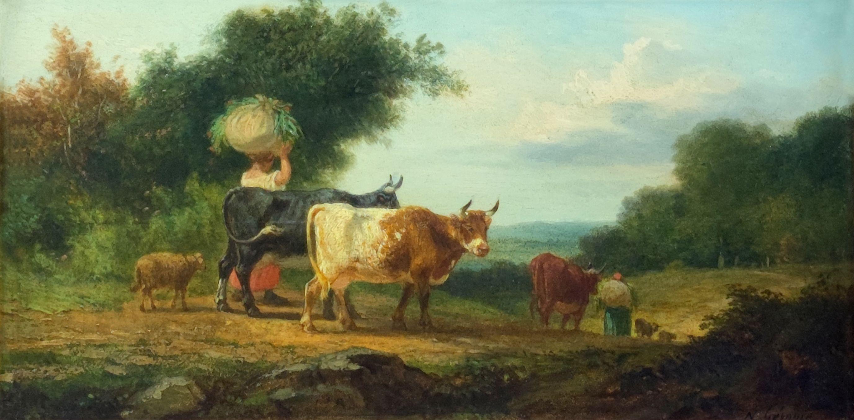 Paysannes et vaches, huile sur panneau, signée N. Gerome, 17x35 cm