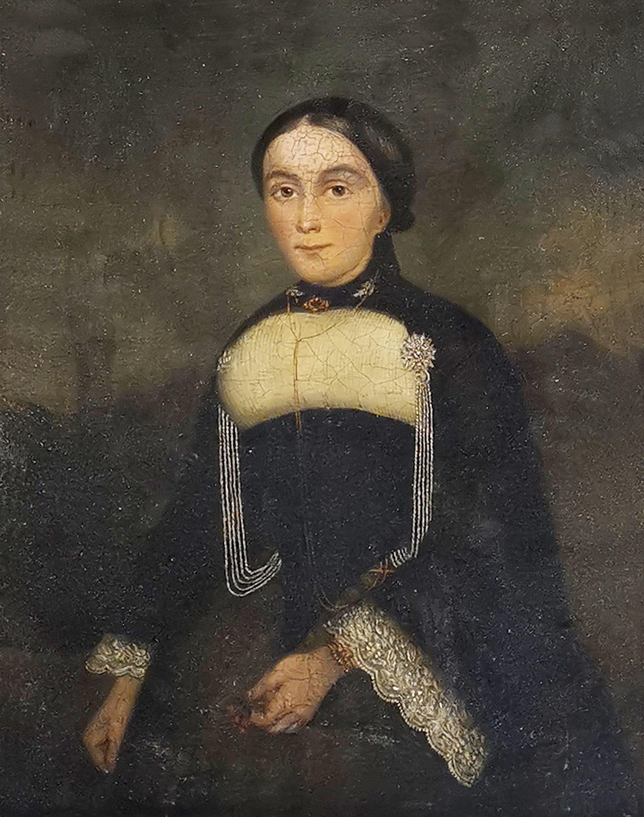 Portrait de femme en costume noir, huile sur cuivre, 44x35 cm