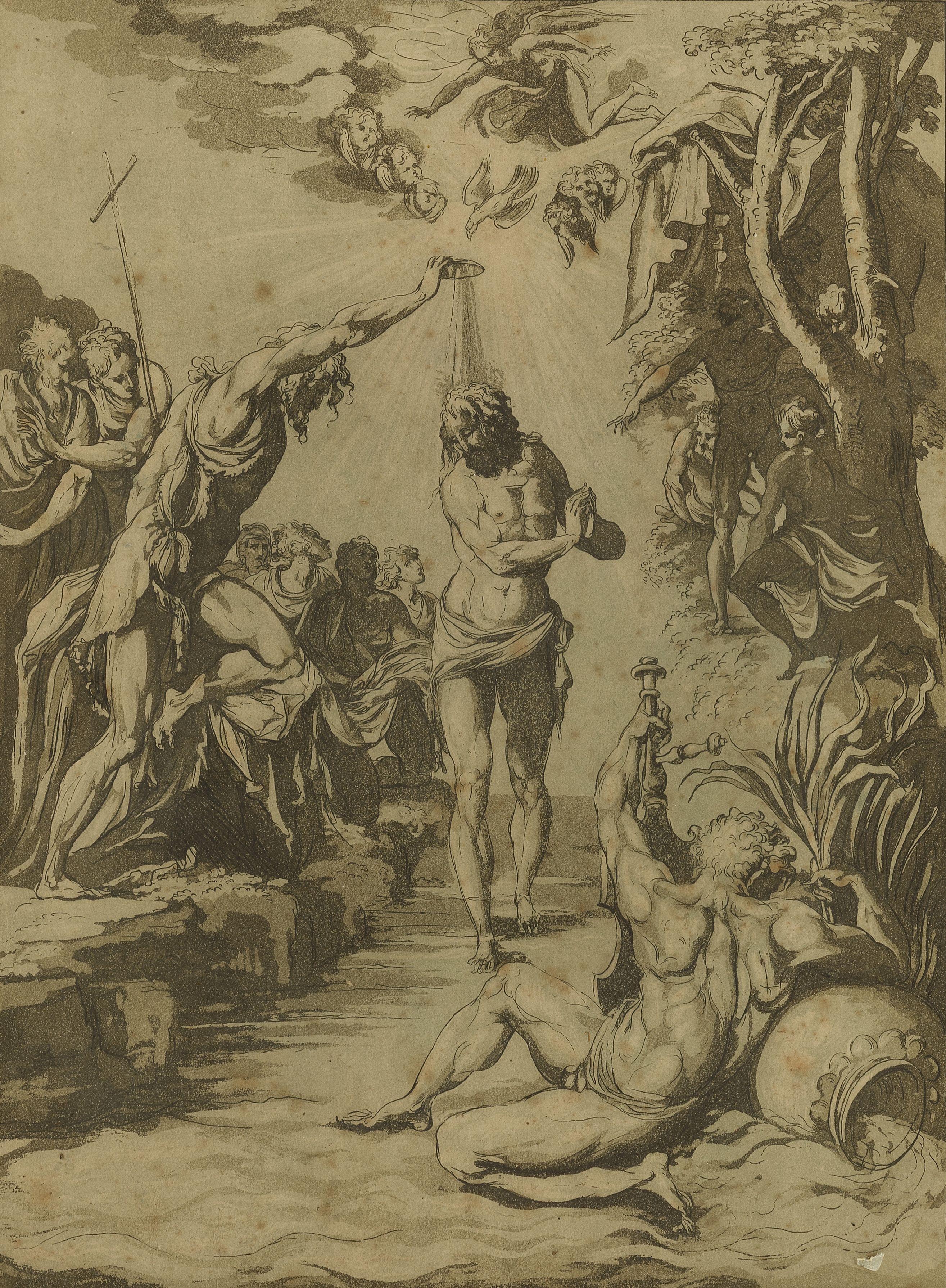 Tages et Heleno, paire de figures allégoriques de fleuves, encre...